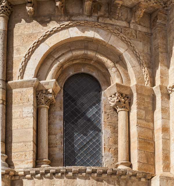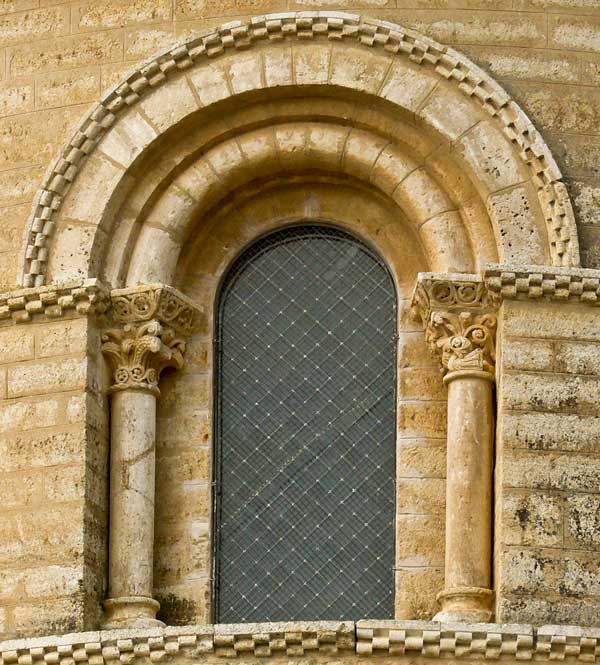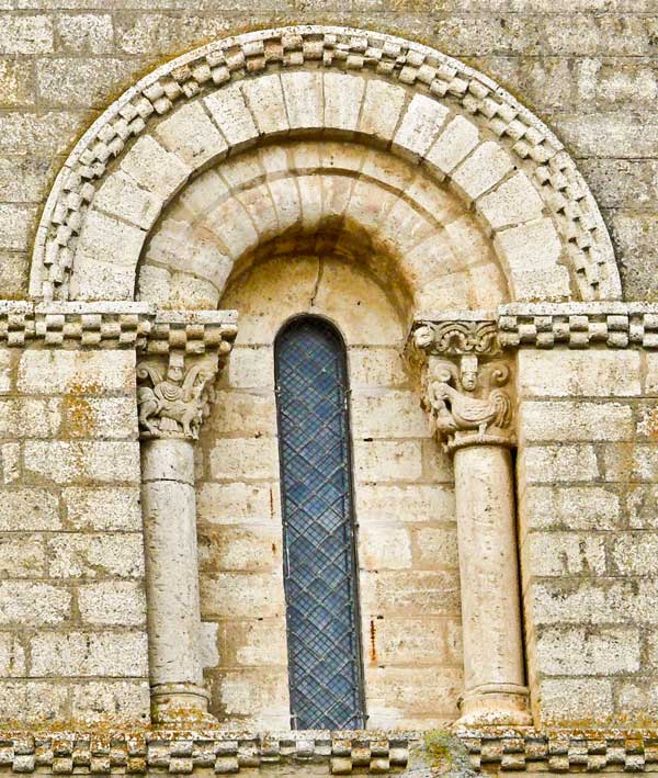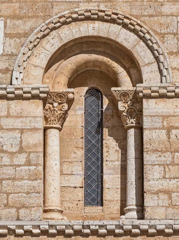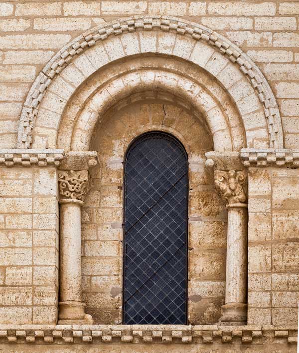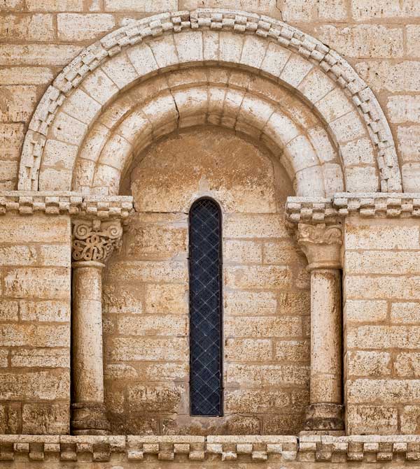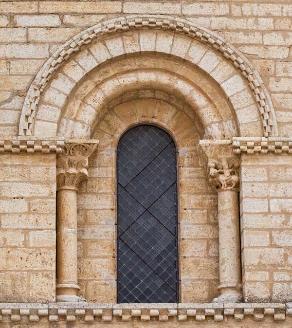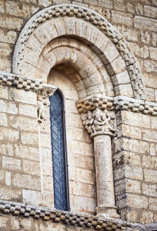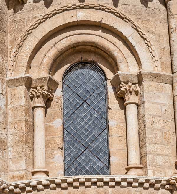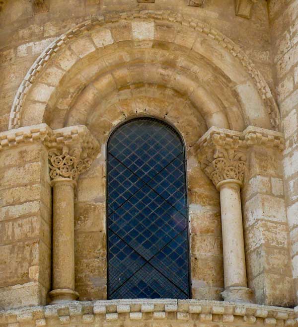 La presente fotografía es muy parecida a la anterior con un encuadre más ajustado a la ventana lateral derecha del ábside meridional. El hueco primitivo había quedado reducido a un ventanuco insignificante, observándose además la pérdida de la imposta ajedrezada inferior que corría por la base del vano. |