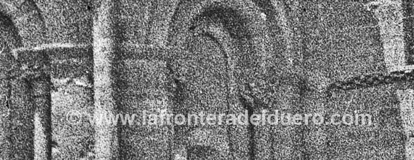 Por la elevación y el campo que abarca la adjunta fotografía parece que está hecha desde el púlpito. Se capta en ella en el centro y en primer plano la pilastra que soporta los arcos torales del presbiterio y del brazo norte del transepto. En relación con el primero de estos arcos, el triunfal, afirma M. Aníbal Álvarez que «está sostenido por ménsulas en vez de columnas», que existe «una inscripción de letra gótica tallada sobre el frente de este arco» y que es todo «de colores muy chillones». Como se puede apreciar, el capitel del arco triunfal estaba bárbaramente destrozado y cubierto por un revoco pintado y parcialmente desprendido; descargaba sobre una ménsula que parece ser un residuo del segmento superior del primitivo fuste. De la inscripción del arco triunfal alcanza a leerse en la foto: «Domine quis habitabit in tabern(aculo)...»; por otra parte, como puede comprobarse por la fotografía siguiente (Foto 06) el texto acaba con las palabras «et Johel». Todo indica que se trata de una inscripción de inspiración bíblica dedicando la capilla mayor «Al Señor que habitó en el tabernáculo ... y Joel». Esto contradice la exposición que se hace en la prestigiosa Enciclopedia del Románico de la Fundación Santa María la Real en la que se afirma: «Durante el proceso de restauración del templo, a comienzos del presente siglo se perdió el resto de una inscripción moderna, grabada sobre las dovelas del arco triunfal del ábside mayor y que conocemos gracias a Jovellanos: ...ESTA CAPILLA DEL MILAGRO EL VIZCONDE DON JUAN VIVERO, FIJO DE LUIS PEREA DE VI(vero)...». A la izquierda, al fondo del transepto, se abría una capilla gótica con acceso bajo arco carpanel en la que se encontraba «una puertecita de tan reducidas dimensiones, que apenas permite el paso de un hombre y que comunica con la torre de planta poligonal», según M. Aníbal Álvarez. |