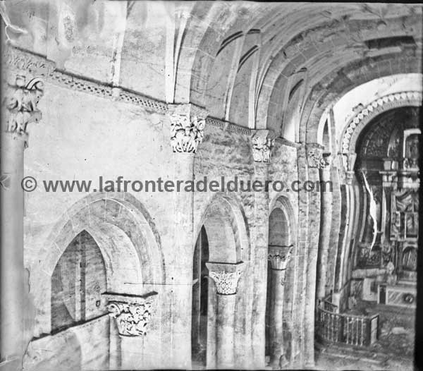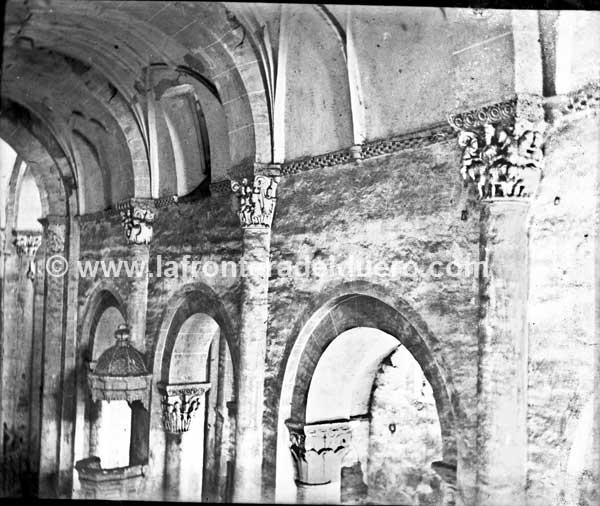 Esta fotografía, como se ve, muestra la arquería derecha de la nave central y, al igual que la siguiente (Foto 04), debió estar hecha sin duda desde el coro que existía a los pies de la nave. Se distinguen con cierta claridad algunos de los capiteles tanto de los arcos fajones como de los formeros y, en cuanto al mobiliario, también aparece el ambón con su tornavoz característico. Pero lo que realmente llama la atención es la nervadura de la bóveda central. Como puede constatarse en la imagen, de cada uno de los ángulos que forman los cimacios de los capiteles con la imposta parte un haz de triples nervios y otros dos dobles de los trechos intermedios de esa imposta; todos ellos confluyen en un botón central en la clave del respectivo tramo. Apoyan en modillones intercalados en la moldura taqueada. A pesar de esta evidencia nadie que yo sepa ha mencionado nunca la existencia de esta tracería impropia de la época en que se erigió el templo y que cabe suponer que fue añadida en un momento muy posterior. El propio M. Aníbal Álvarez al describir la iglesia dice: «Las naves de la Iglesia son tres en sentido longitudinal y en cañón seguido» sin mencionar la existencia de tales nervios. Se observa también que la bóveda estaba perforada en su segundo tramo por un ventanal que, dada la disposición de la cubierta, abría a la nave lateral contigua y no al exterior. |