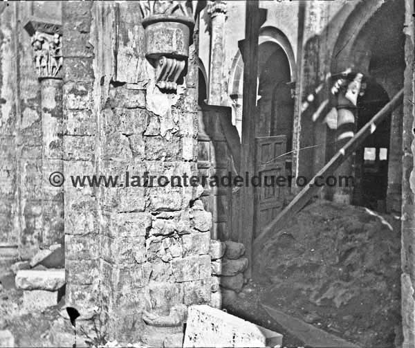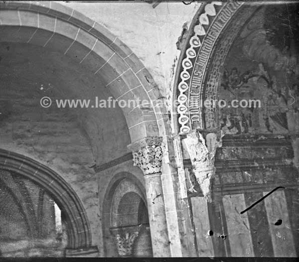 Lo que trasmite esta fotografía es puro dramatismo. Muestra la pilastra del vértice sureste del crucero en la que cargan los arcos torales del presbiterio y del brazo meridional del transepto. El cimacio del capitel está fragmentado por el esfuerzo que soporta, el propio capitel está partido por la mitad y el fuste ha estallado materialmente colapsado por la fatiga a una compresión que supera su capacidad resistente. Estos y otros signos de ruina que se advierten en la imagen fueron determinantes para que se diera en su día la voz de alarma por la precariedad de todo la edificación. La responsabilidad hubo de ser asignada al campanario levantado inconscientemente sobre el cimborrio románico. Se aprecia también el extremo derecho del arco triunfal descansando sobre una ménsula cónica invertida con interposición de un prisma guarnecido y pintado sustitutorio del primitivo capitel.