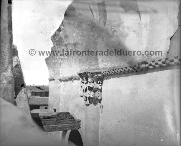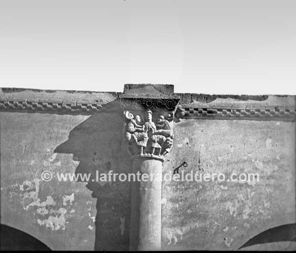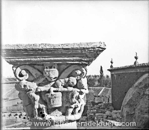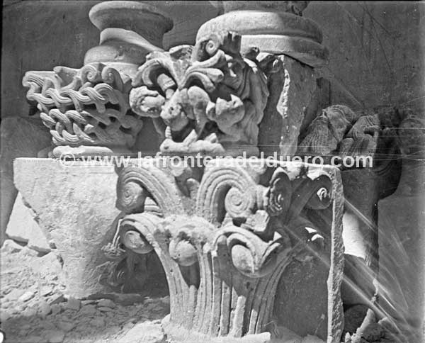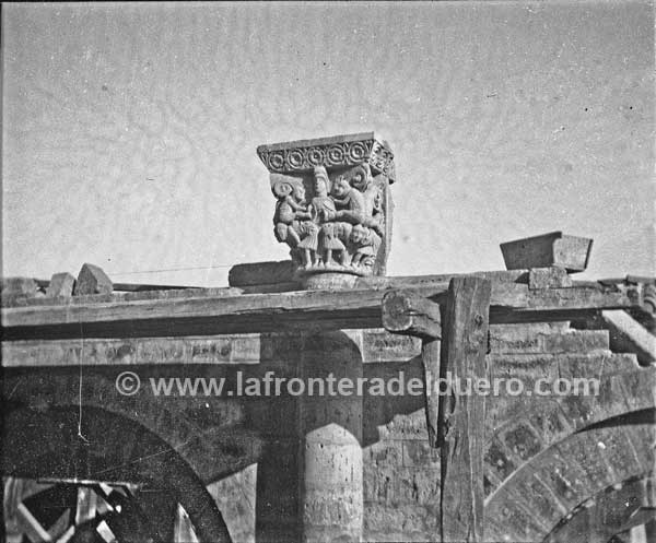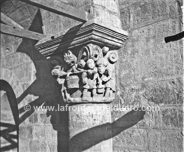 Capitel 28 del esquema numerado de planta visto desde su misma altura lo que supone haber dispuesto de un andamiaje adecuado. Debió ser el que sirvió para desmontar la bóveda y el propio muro al que estaba adosada esa columna, si bien en el momento de realizarse la fotografía, en 1896 con toda seguridad, no se había derribado éste y la bóveda sólo parcialmente, pues aunque penetra por arriba la luz solar todavía se mantenía al menos el salmer del arco y las primeras hiladas de la bóveda. |