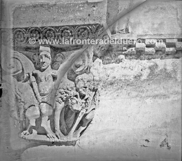 El capitel fotografiado aquí es el 48 del esquema numerado de planta visto desde el interior del templo. En el momento en que se obtuvo la fotografía estaba en fase de desmontaje como todo el muro meridional. Las hiladas del muro que trasdosaban el capitel ya se habían retirado por lo que éste quedaba encaramado en la columna y exento teniendo por fondo la población de Frómista. Se aprecia a la derecha la rosca externa del arco de la ventana próxima que no se había desmantelado todavía aunque sí el muro circundante. |