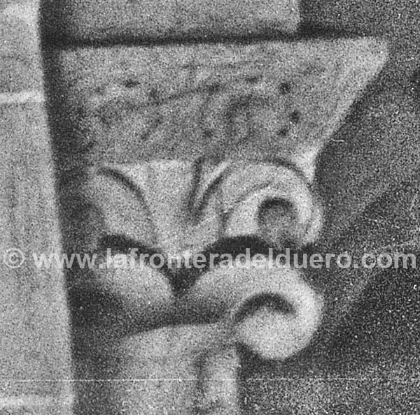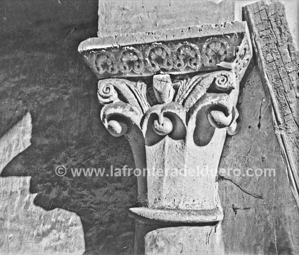 La fotografía que se muestra al margen fue tomada en el año 2007. La cesta del capitel estaba reducida a una masa informe de piedra en la que todavía se atisbaba un vestigio de su primitiva talla sobre motivos vegetales. En esta otra fotografía realizada en 2013 ya no queda ni un indicio de aquella ornamentación. El cimacio se encuentra sin labrar. |