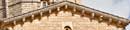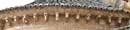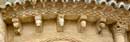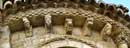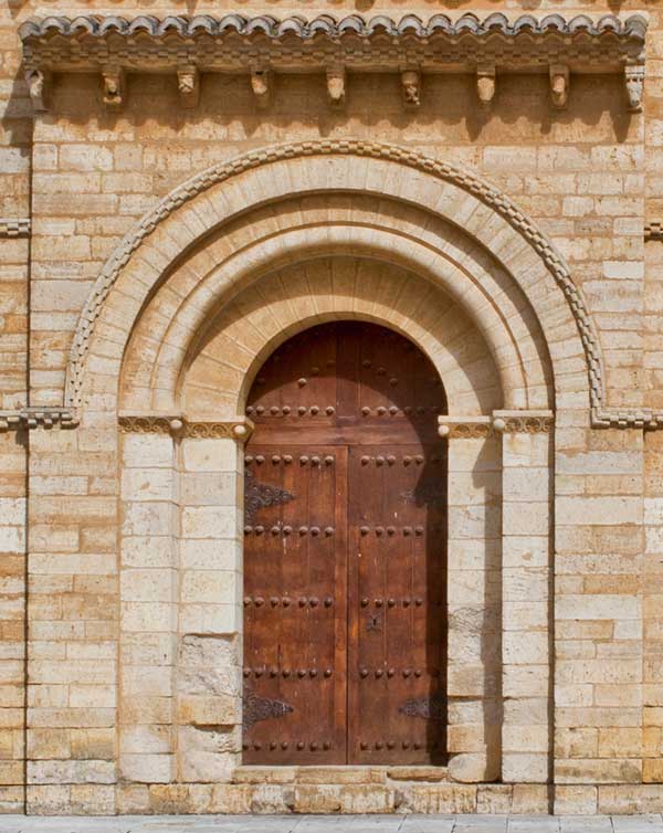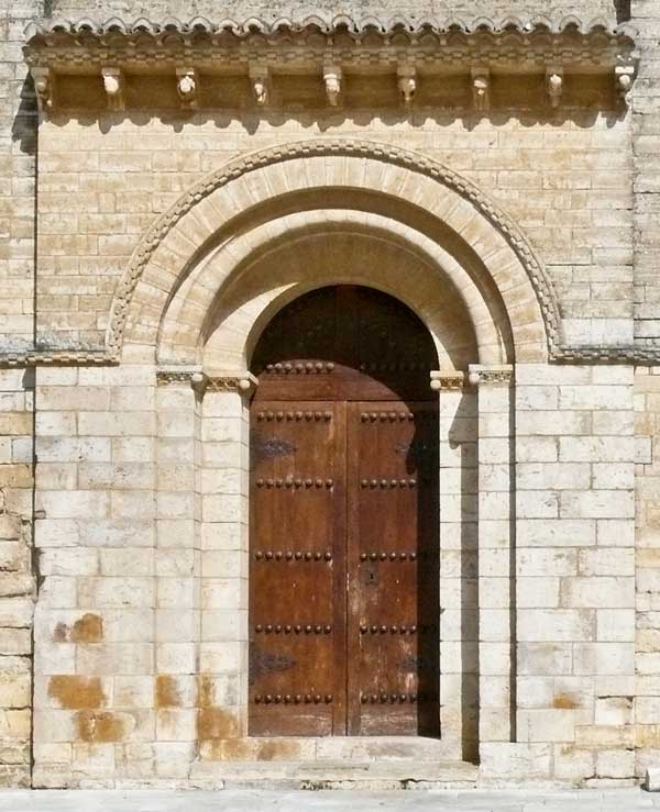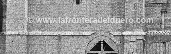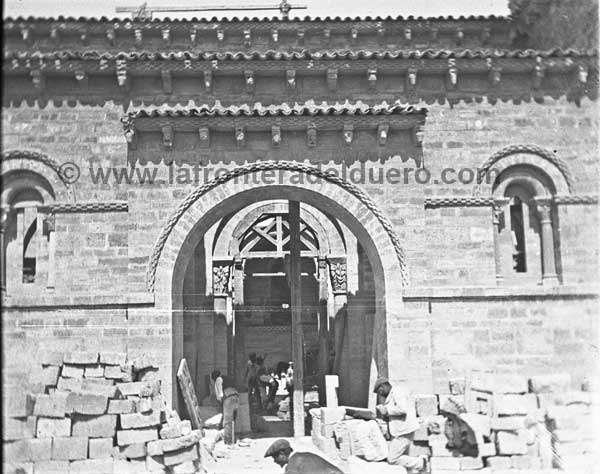 Una vista parcial de la fachada sur con la portada de acceso a la nave lateral sobre el exiguo arimez y las dos ventanas que la flanquean. Luce sobre la portada el tejaroz que había sido destruido en algún momento de su historia, y por encima las dos alineaciones de cornisas cuajadas de canecillos. Hay dos cosas que llaman la atención: una, la imposta lisa que corre por la base de las ventanas y que hoy es ajedrezada como todas las demás, lo que indica que se montó en bruto para ser tallada con posterioridad «in situ»; la otra, la portada formada exclusivamente por el arco externo y su chambrana, pues como se verá luego al hablar del tercer proyecto de 1901 se reconstruyó inicialmente como se la había encontrado y se decidió en aquel momento reducir ese gran hueco con dos roscas más sobre jambas y cerrarlo con puertas de madera. En cuanto a la labra de la imposta, se efectuó en el último momento ya en abril de 1904 cuando la obra estaba prácticamente acabada, pues en la Foto 27 tomada en esa fecha se aprecia que se estaba trabajando en su tallado. |