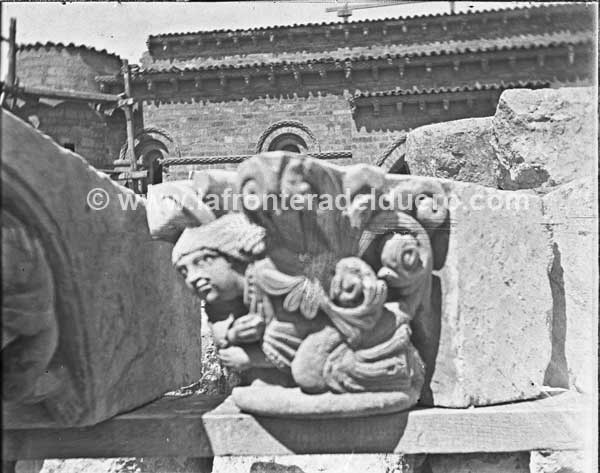 Ante la fachada sur se fueron acopiando los materiales desmontados, capiteles, canecillos, et., para su reinstalación posterior. En esta fotografía se ve en primer plano el capitel derecho de la ventana central del ábside principal. A su izquierda un canecillo, y al fondo la iglesia cuya cubierta sobre la nave central se hallaba sin concluir en la zona de unión con el hastial occidental. El husillo del lado meridional también está falto de remate y envuelto en andamiajes. |