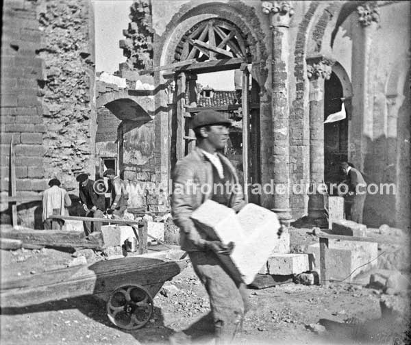 Una fotografía realizada desde la misma posición y casi en el mismo momento que la anterior de la que no diferiría si no fuera porque se ven los obreros en distinta actitud en una y otra. Al estar realizada por el lado norte, y por tanto a contraluz, ha quedado la imagen bastante oscura y sin detalle. |