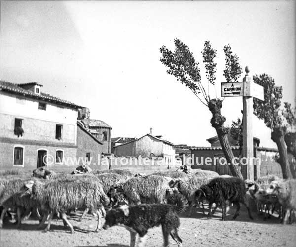 Por fin, a título curioso, un rebaño con su perro pastor en primer plano que debió llamar la atención de M. Aníbal Álvarez. La iglesia asoma al fondo percibiéndose sólo el ábside principal y pudiéndose constatar que el cimborio y el hastial del transepto no estaban reconstruidos. Una señal informa de por dónde ir a Carrión. |