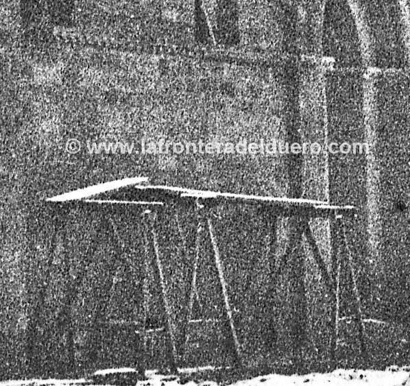 La pasarela en sí misma estaba en absoluta situación de precariedad. Construida con armazón de madera, la cubrición se había desvencijado dejando abatidas sus armaduras. Quedan también en evidencia en la imagen, por otro lado, los destrozos que se habían producido en la cubierta del ábside central.