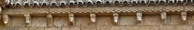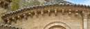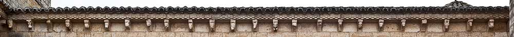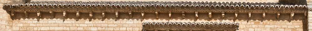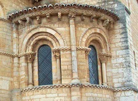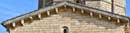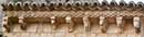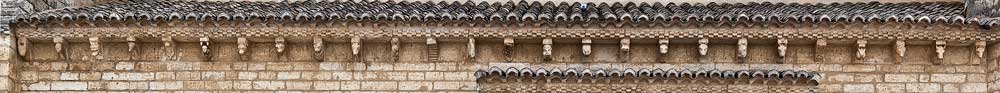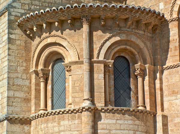 En la fotografía del conjunto de la cabecera que se exhibe más arriba (Foto 01) se aprecia además parte de ese cuerpo de campanas encaramado sobre el cimborrio, la sacristía adosada al hastial meridional del transepto, y una parte de la capilla del lado opuesto que aparece por la derecha de la imagen, constatándose asimismo el mal estado de la sillería de los zócalos de los ábsides. |