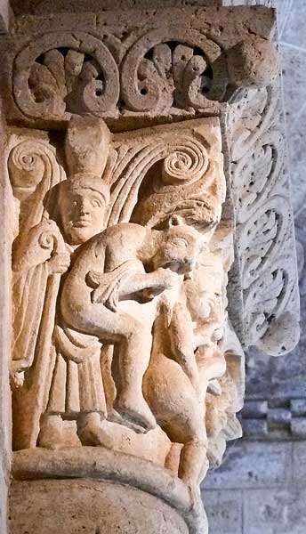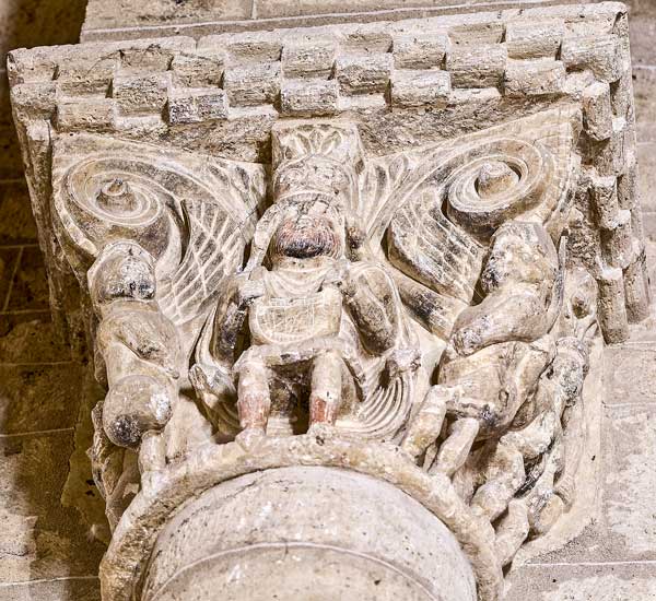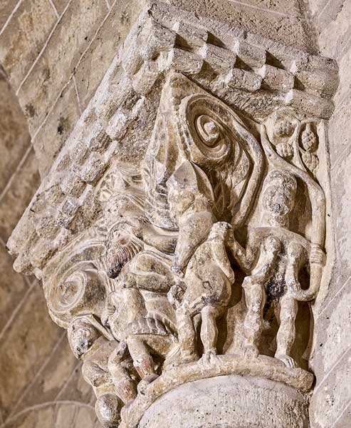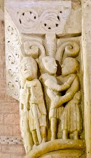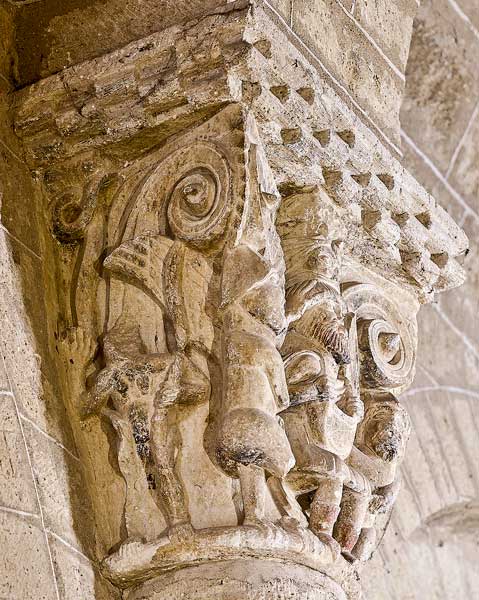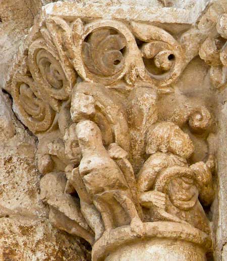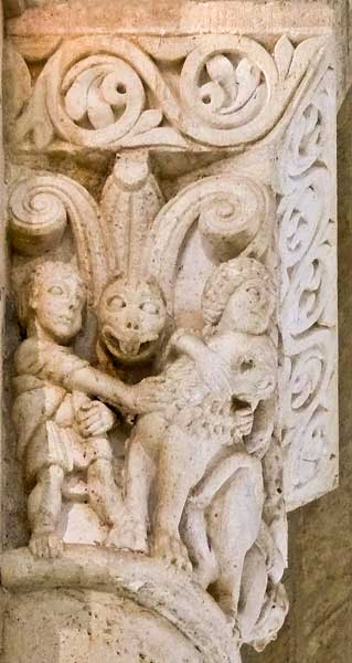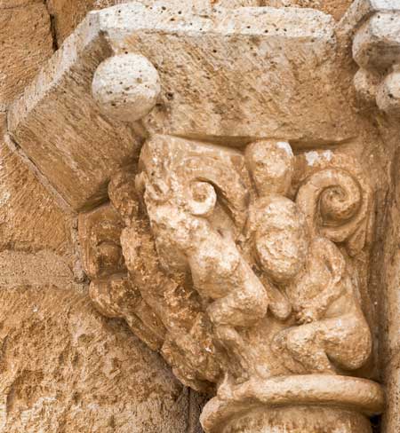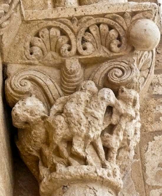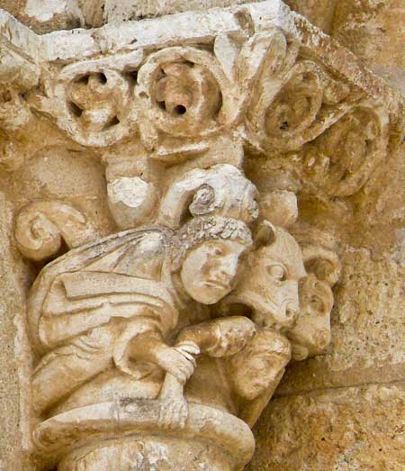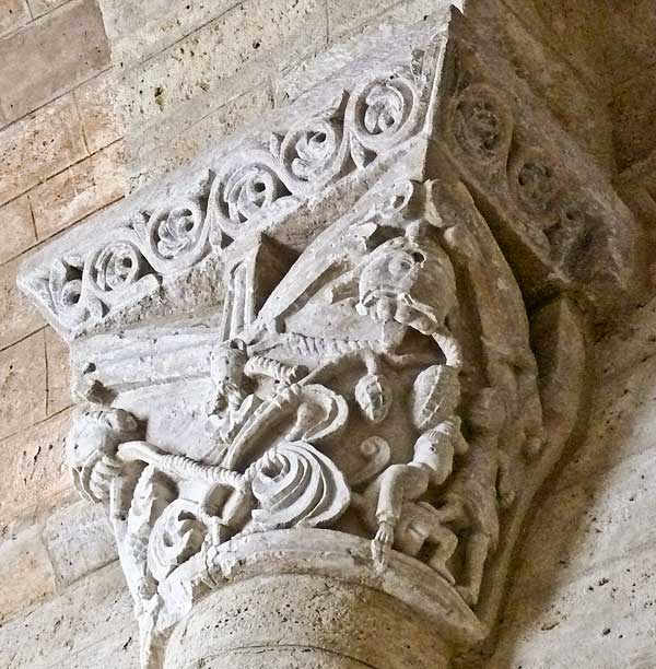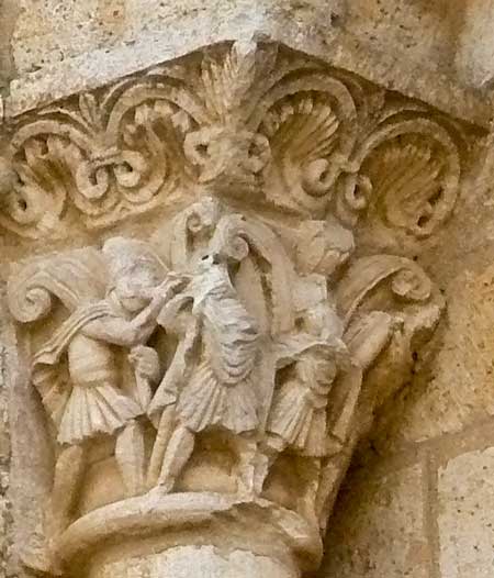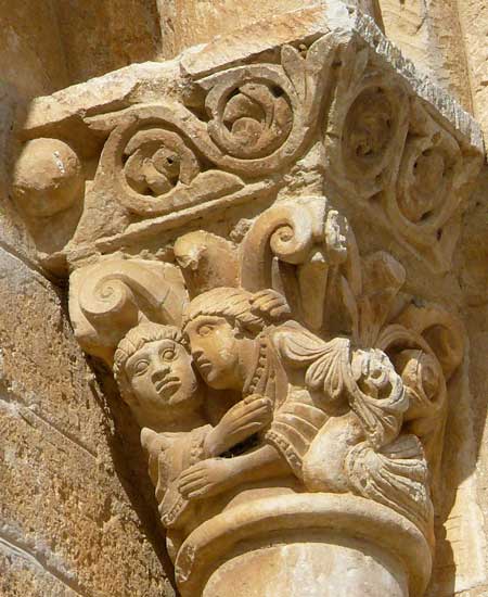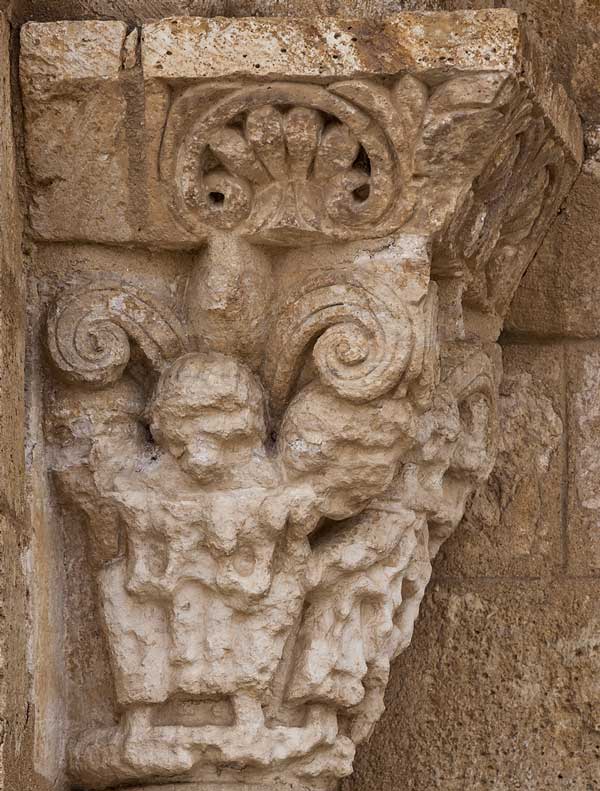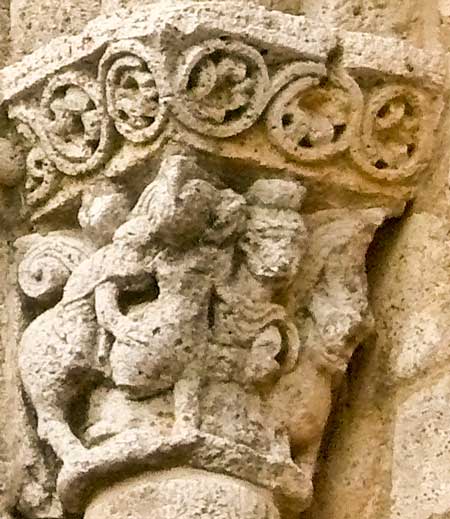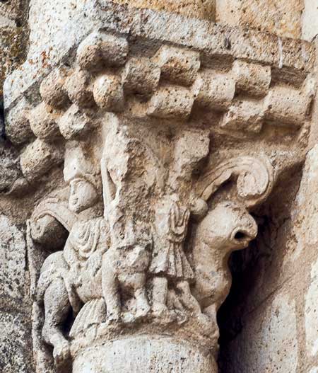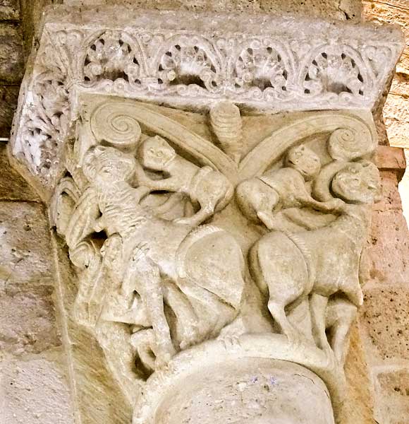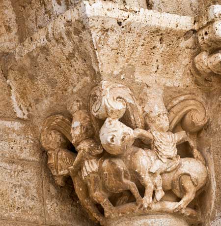 En el centro de la cara frontal aparece arriba una cabecita de animal y en los vértices sendas máscaras de cuyas bocas salen -o muerden con ellas- tallos vegetales sogueados que terminan en piñas. La escena de la cara derecha muestra a dos personajes, uno de los cuales parece someter al otro asiéndole por el pelo y sujetándole con un pie puesto sobre la pierna del subyugado que hinca una rodilla en tierra. Se ha especulado sobre su simbolismo queriendo ver algunos a Caín y Abel, otros a Abraham e Isaac, y algunos un pasaje de la vida de san Martín de Tours. En la cara izquierda se ve un caballero sobre el que también se han vertido diversas y subjetivas interpretaciones. El cimacio se adorna con roleos y palmetas dentro de ellos. |