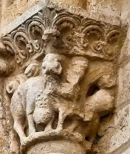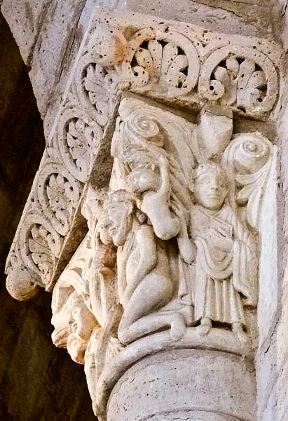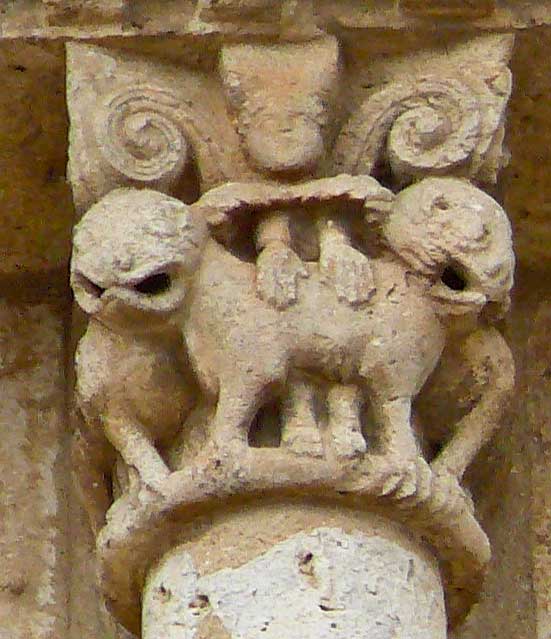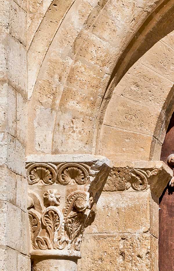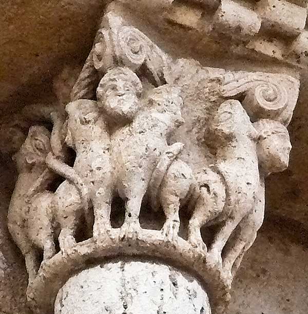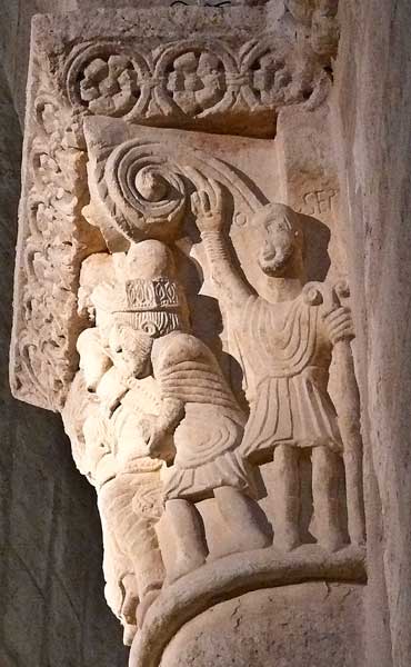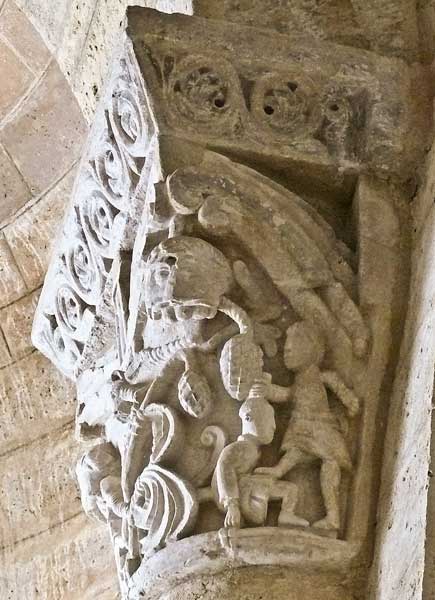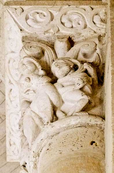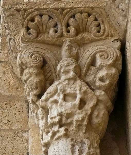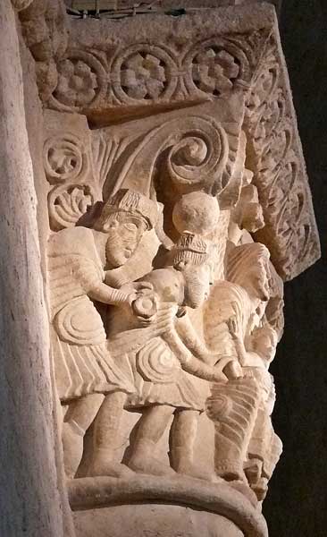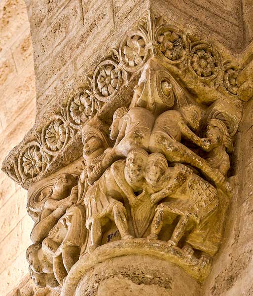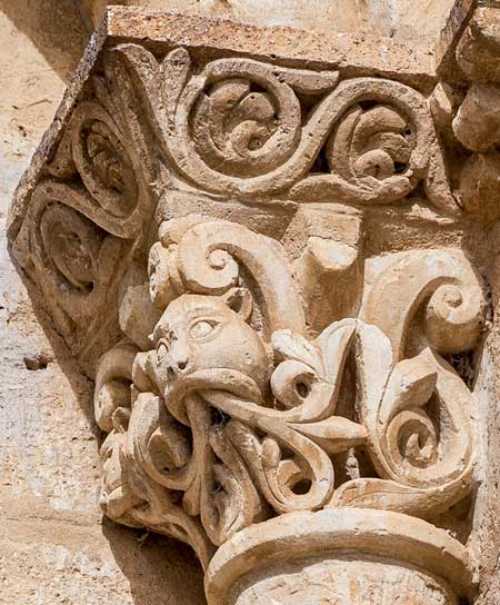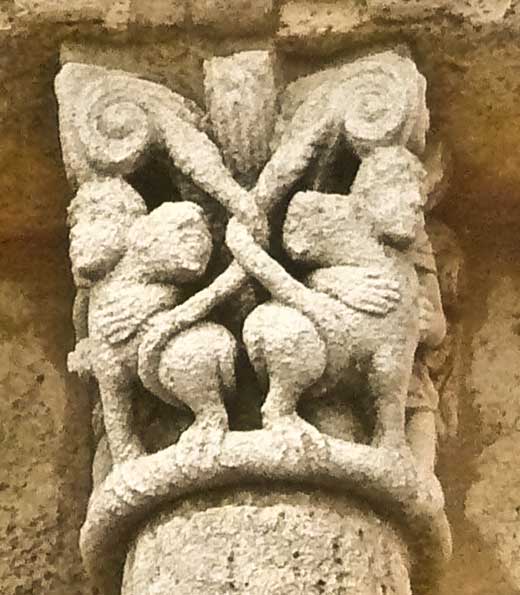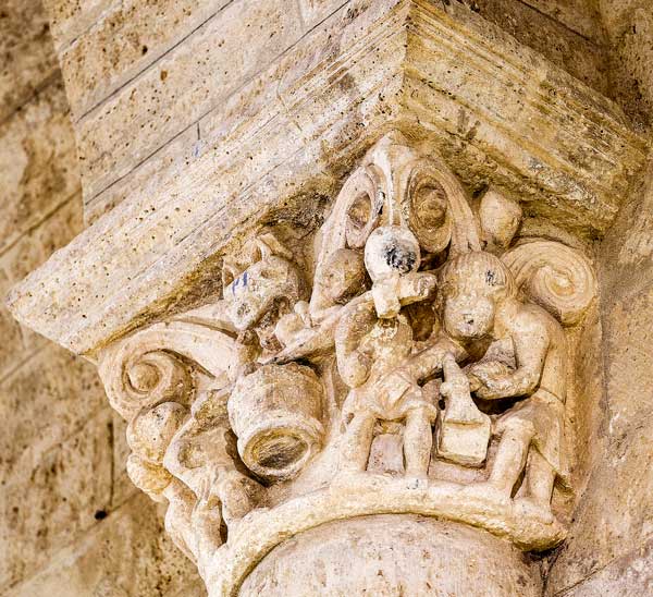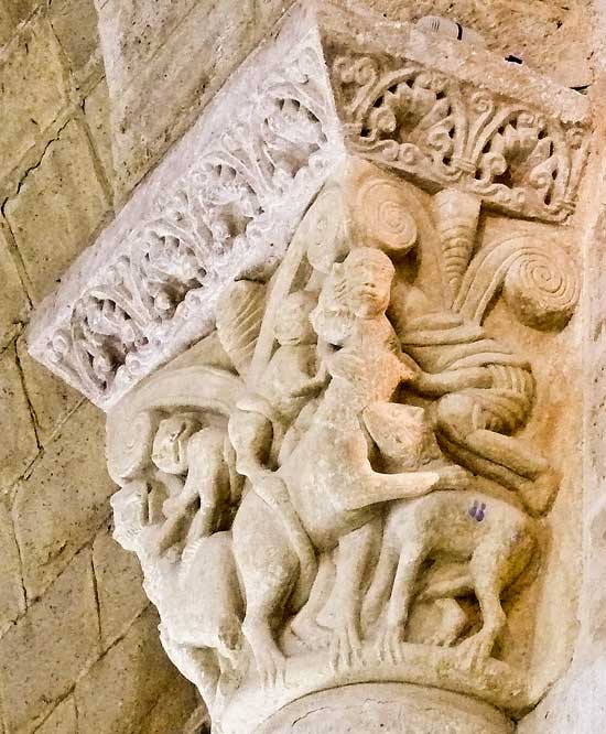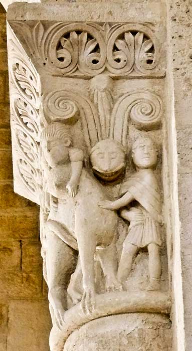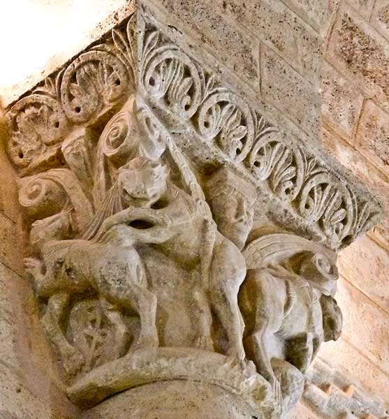 En el centro de la cara frontal aparece arriba una cabecita de animal y en los vértices sendas máscaras de cuyas bocas salen -o muerden con ellas- tallos vegetales sogueados que terminan en piñas. La escena de la cara derecha muestra a dos personajes, uno de los cuales parece someter al otro asiéndole por el pelo y sujetándole con un pie puesto sobre la pierna del subyugado que hinca una rodilla en tierra. Se ha especulado sobre su simbolismo queriendo ver algunos a Caín y Abel, otros a Abraham e Isaac, y algunos un pasaje de la vida de san Martín de Tours. En la cara izquierda se ve un caballero sobre el que también se han vertido diversas y subjetivas interpretaciones. El cimacio se adorna con roleos y palmetas dentro de ellos. |