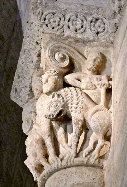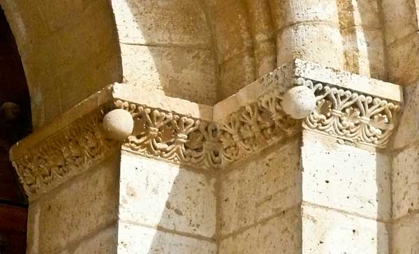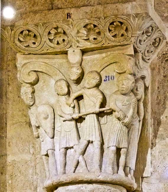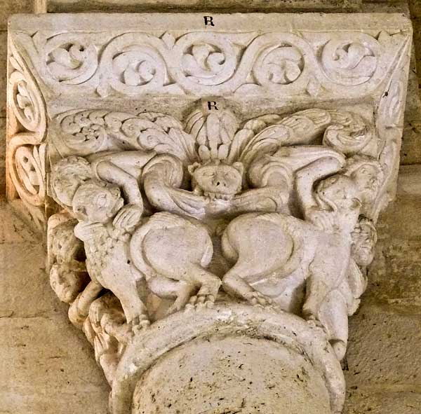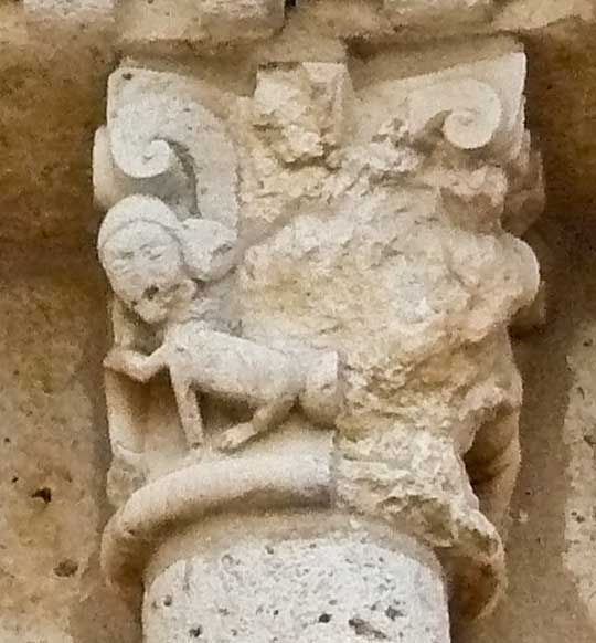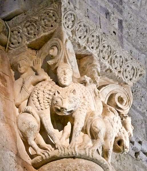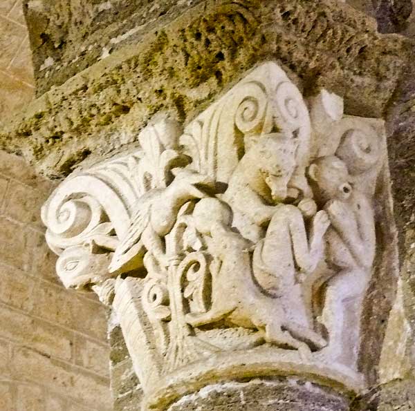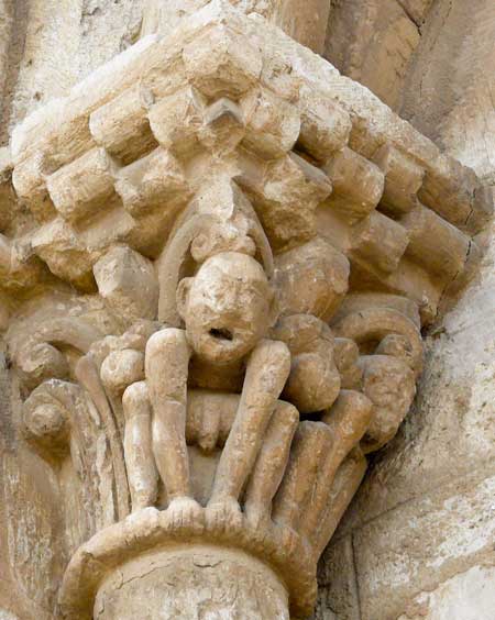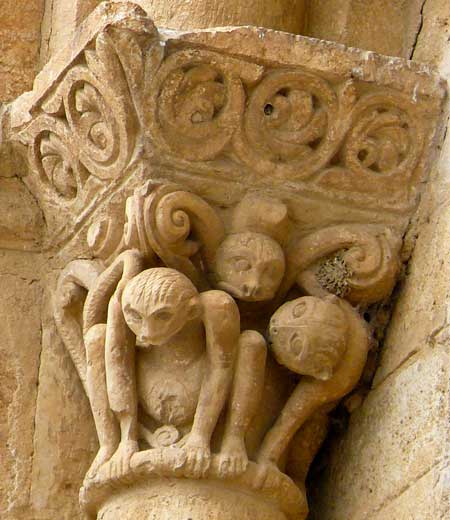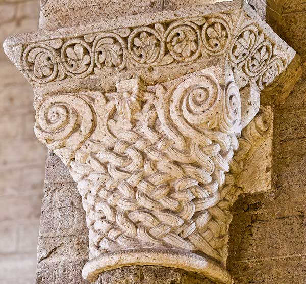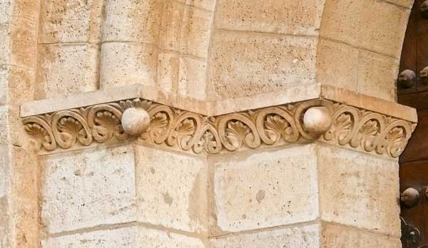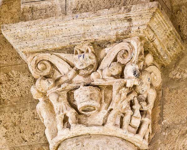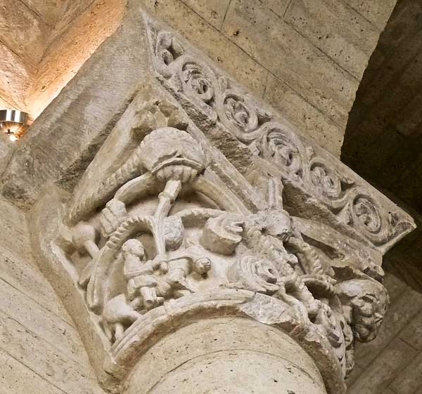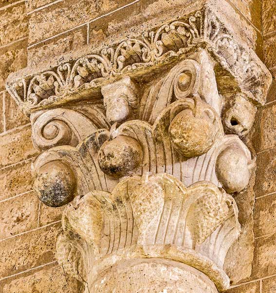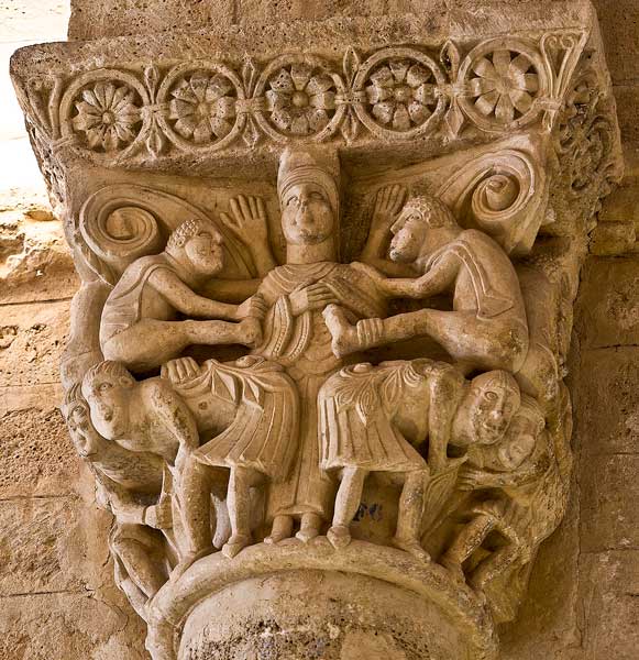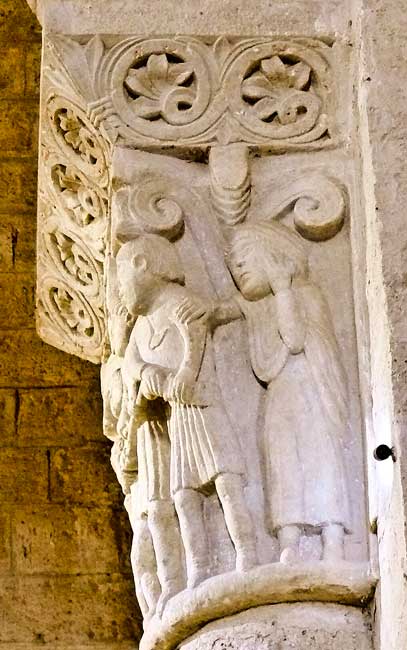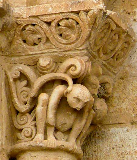 En el centro de la cara frontal aparece arriba una cabecita de animal y en los vértices sendas máscaras de cuyas bocas salen -o muerden con ellas- tallos vegetales sogueados que terminan en piñas. La escena de la cara derecha muestra a dos personajes, uno de los cuales parece someter al otro asiéndole por el pelo y sujetándole con un pie puesto sobre la pierna del subyugado que hinca una rodilla en tierra. Se ha especulado sobre su simbolismo queriendo ver algunos a Caín y Abel, otros a Abraham e Isaac, y algunos un pasaje de la vida de san Martín de Tours. En la cara izquierda se ve un caballero sobre el que también se han vertido diversas y subjetivas interpretaciones. El cimacio se adorna con roleos y palmetas dentro de ellos. |