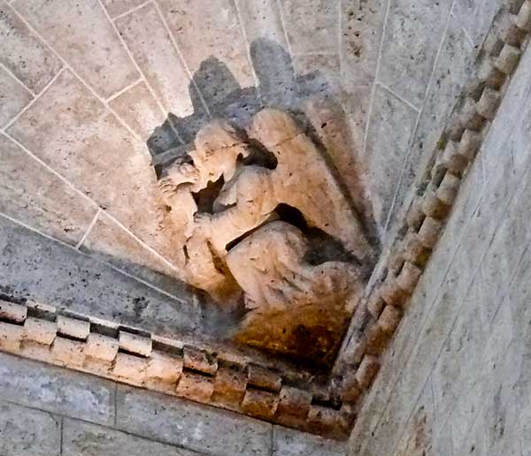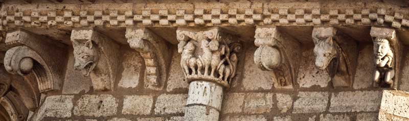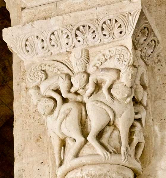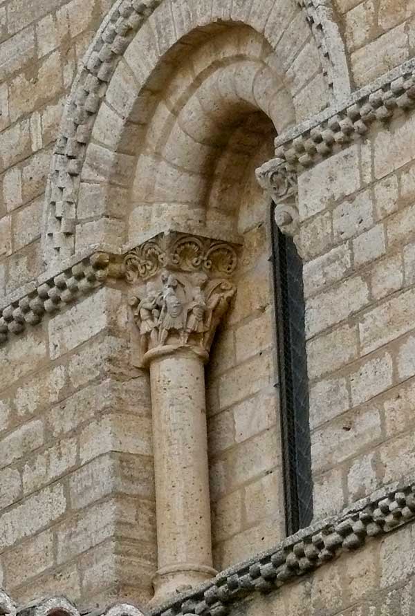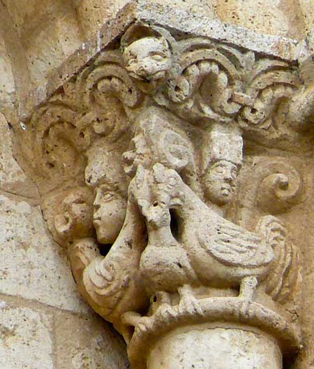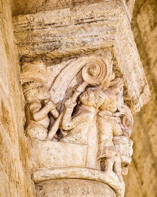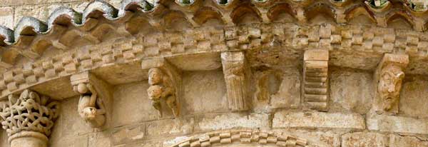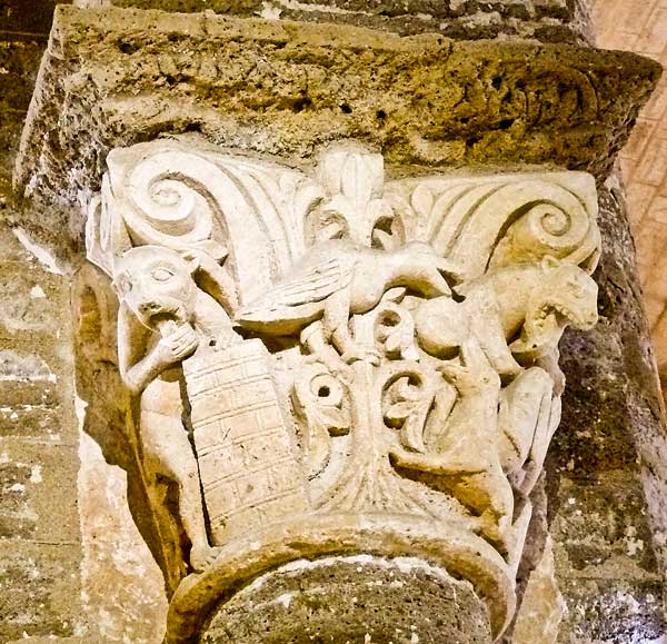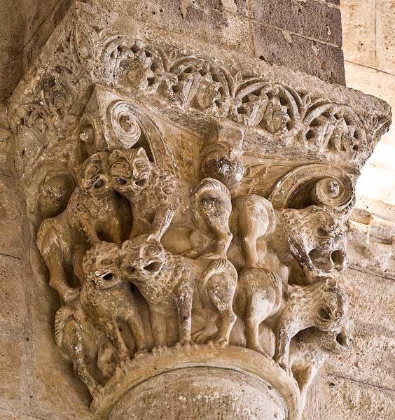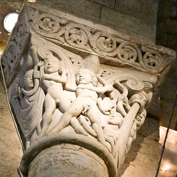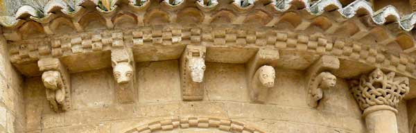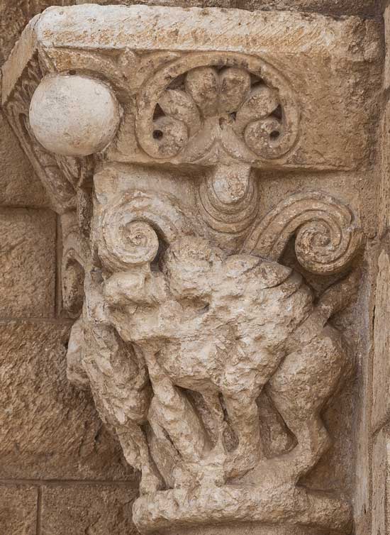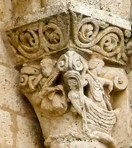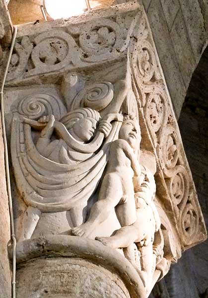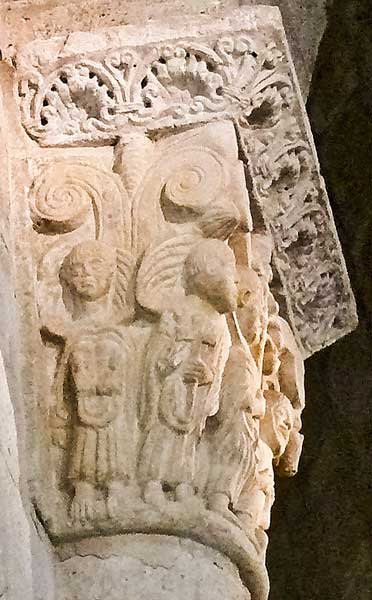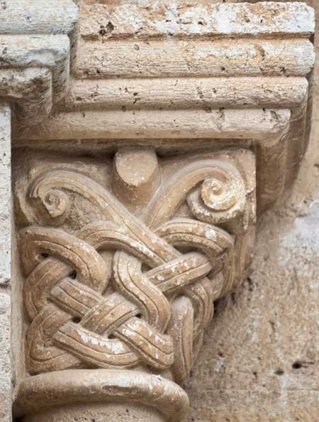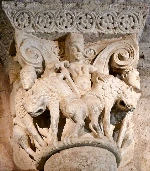 En el centro de la cara frontal aparece arriba una cabecita de animal y en los vértices sendas máscaras de cuyas bocas salen -o muerden con ellas- tallos vegetales sogueados que terminan en piñas. La escena de la cara derecha muestra a dos personajes, uno de los cuales parece someter al otro asiéndole por el pelo y sujetándole con un pie puesto sobre la pierna del subyugado que hinca una rodilla en tierra. Se ha especulado sobre su simbolismo queriendo ver algunos a Caín y Abel, otros a Abraham e Isaac, y algunos un pasaje de la vida de san Martín de Tours. En la cara izquierda se ve un caballero sobre el que también se han vertido diversas y subjetivas interpretaciones. El cimacio se adorna con roleos y palmetas dentro de ellos. |
