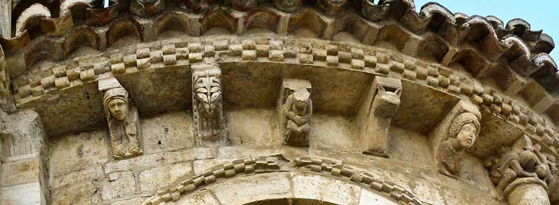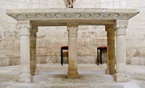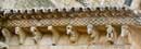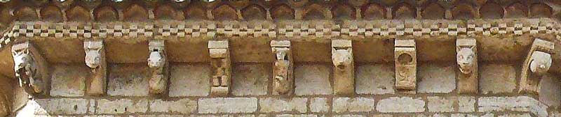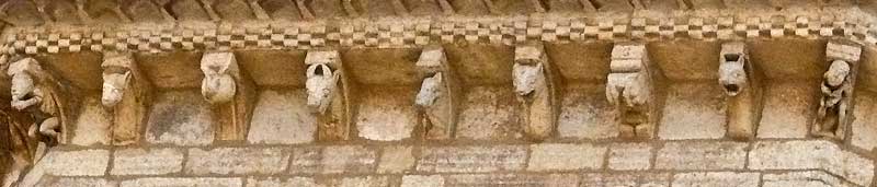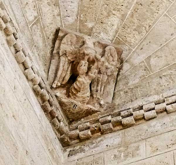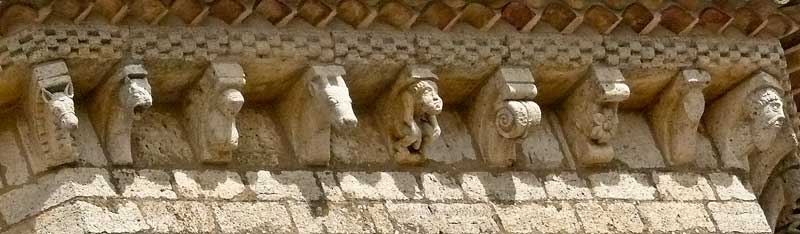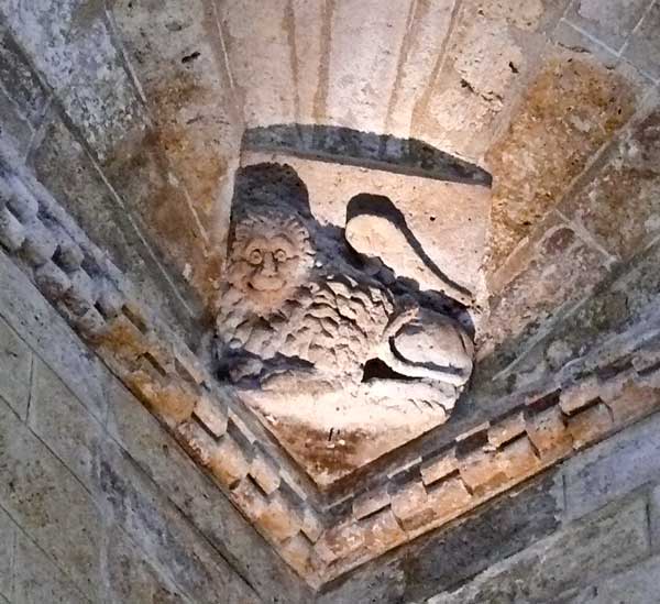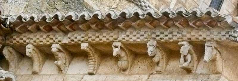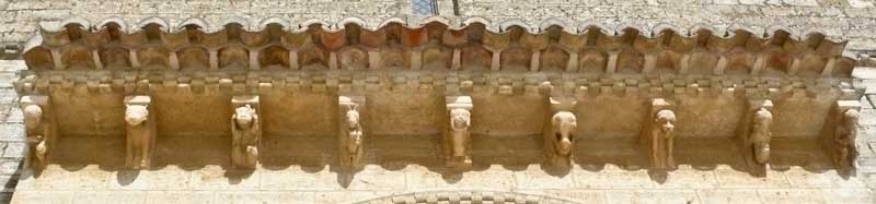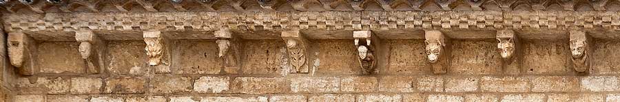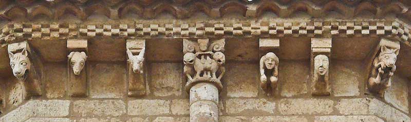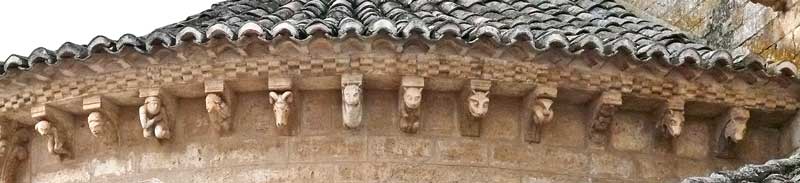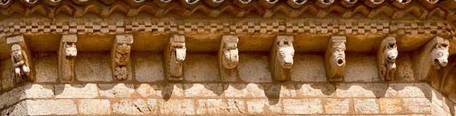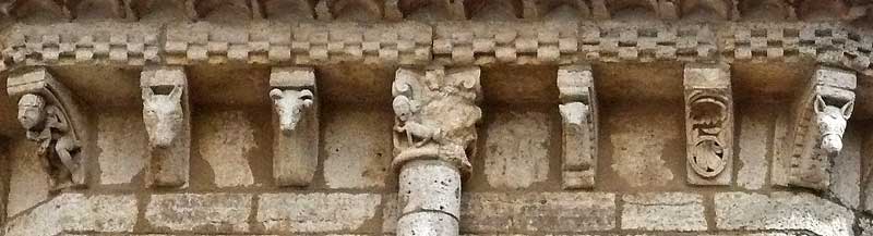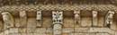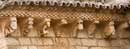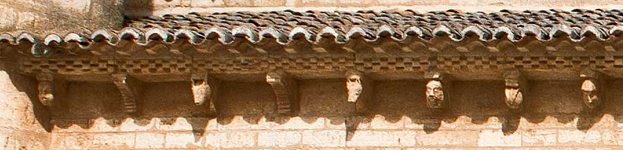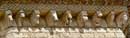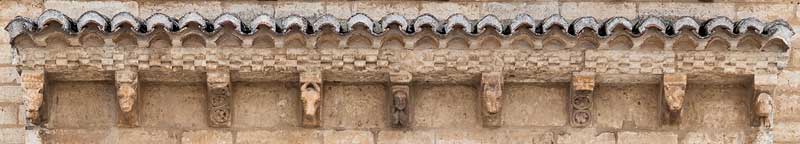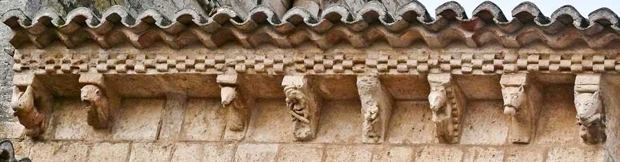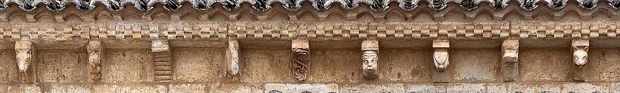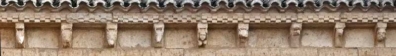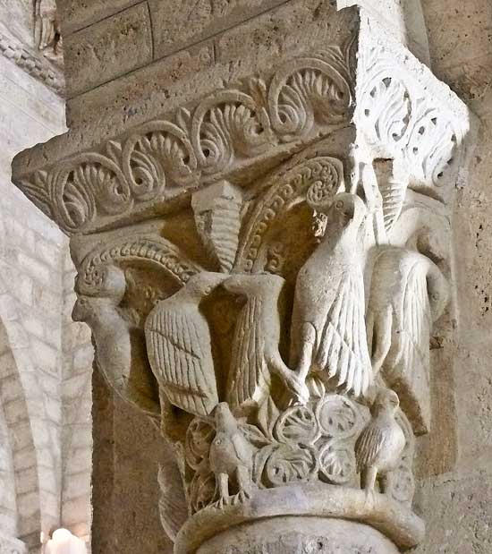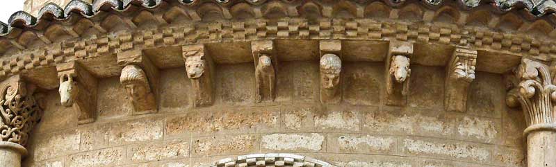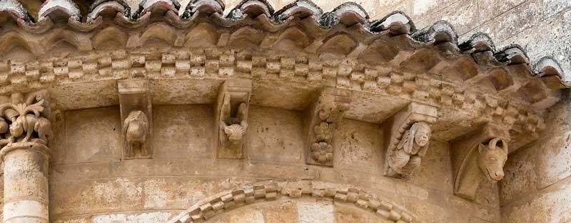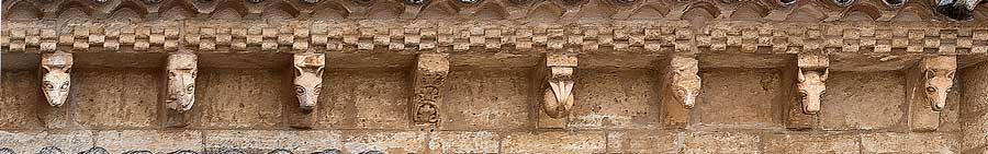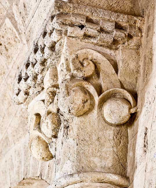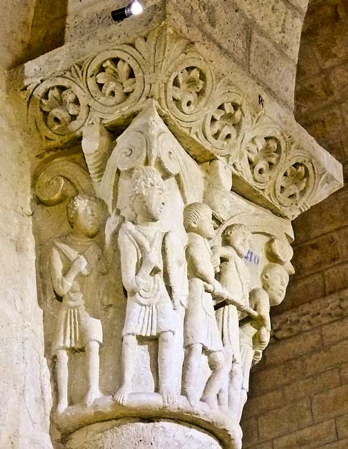 En el centro de la cara frontal aparece arriba una cabecita de animal y en los vértices sendas máscaras de cuyas bocas salen -o muerden con ellas- tallos vegetales sogueados que terminan en piñas. La escena de la cara derecha muestra a dos personajes, uno de los cuales parece someter al otro asiéndole por el pelo y sujetándole con un pie puesto sobre la pierna del subyugado que hinca una rodilla en tierra. Se ha especulado sobre su simbolismo queriendo ver algunos a Caín y Abel, otros a Abraham e Isaac, y algunos un pasaje de la vida de san Martín de Tours. En la cara izquierda se ve un caballero sobre el que también se han vertido diversas y subjetivas interpretaciones. El cimacio se adorna con roleos y palmetas dentro de ellos. |