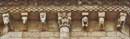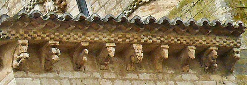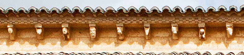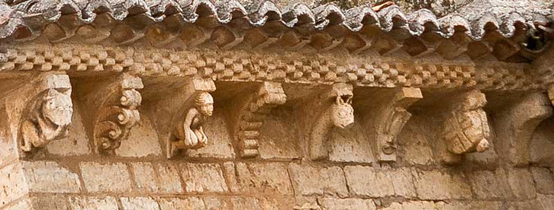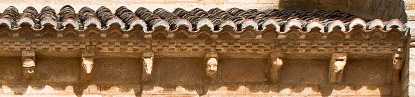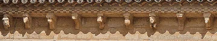 Canecillos desmontados a la espera de ser recolocados. El de la izquierda pertenece al ábside de la epístola y el otro al cimborrio, partes estas de la construcción que se hallaban sin rematar en ese momento. Al fondo se ve la fachada sur de la iglesia. |