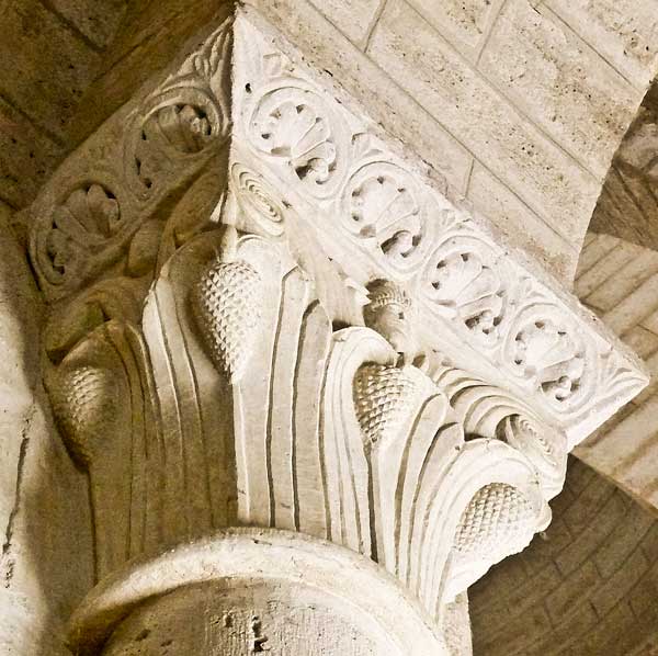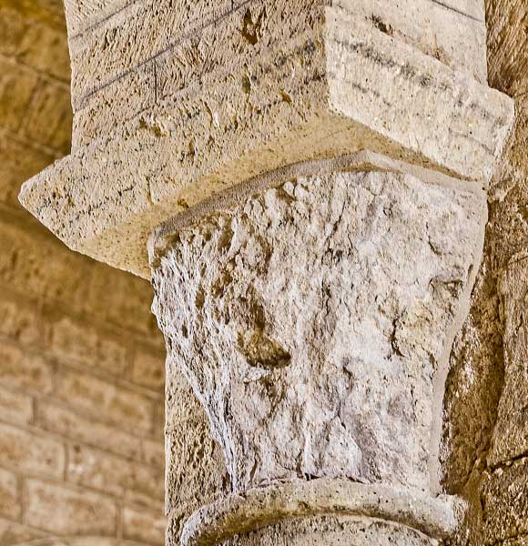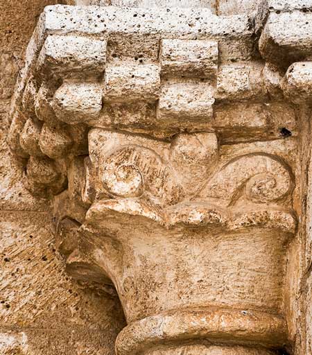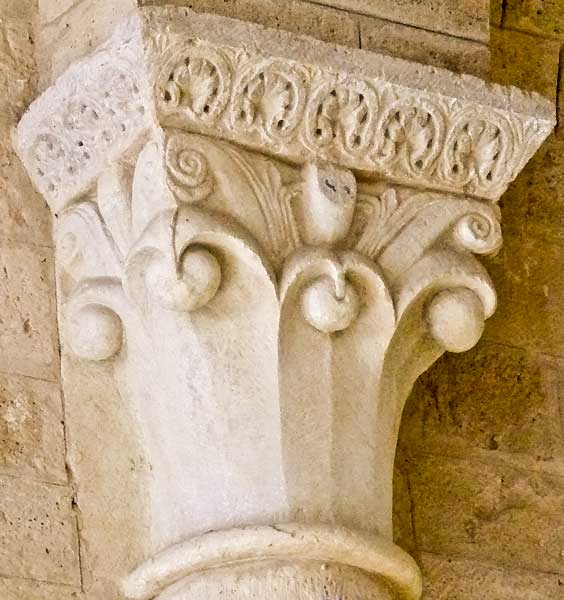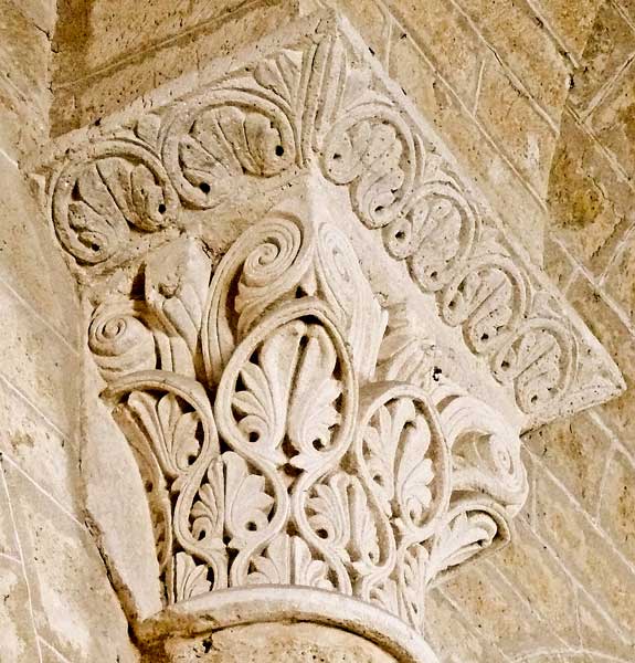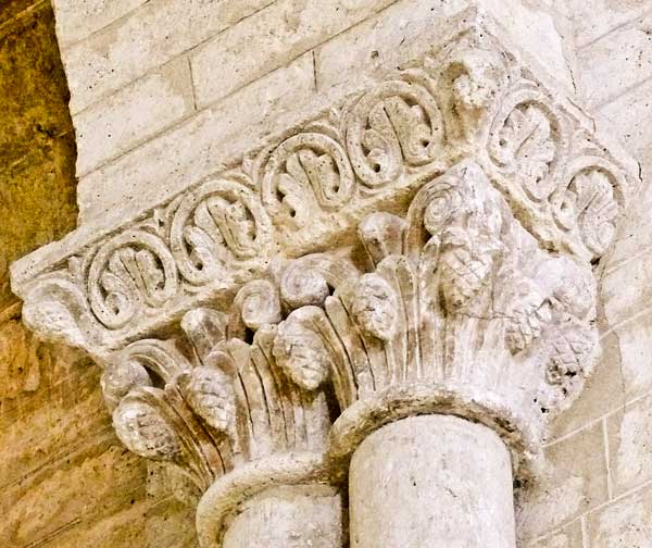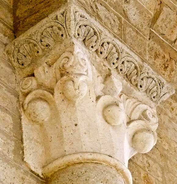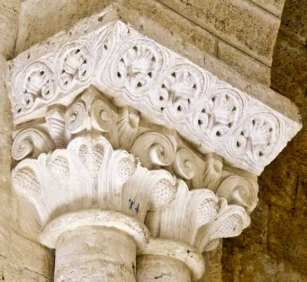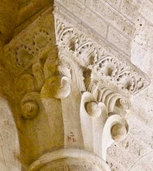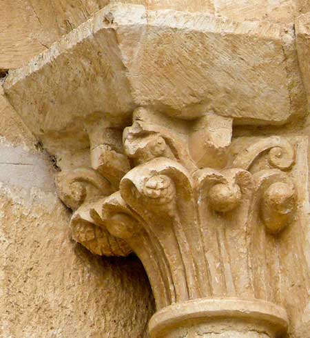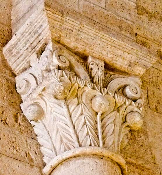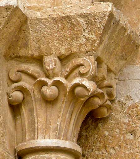 Grandes hojas lisas con un nervio central de cuyo extremo superior pende un fruto esférico. Dos sencillos caulículos completan la cesta. Este capitel, aunque no presenta la R que lo identificaría como repuesto, no sólo ha sido renovado sino que es distinto al que ocupaba su lugar antes de la restauración. Como se observa en la Foto 06 y con más detalle en esta imagen el tambor del capitel primitivo estaba constituido por dos órdenes de volutas vegetales. Ignoro el paradero de aquel capitel y las causas de su sustitución. El cimacio se adorna con veneras y palmetas internas, pudiendo ser el original. |