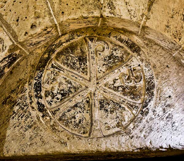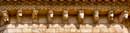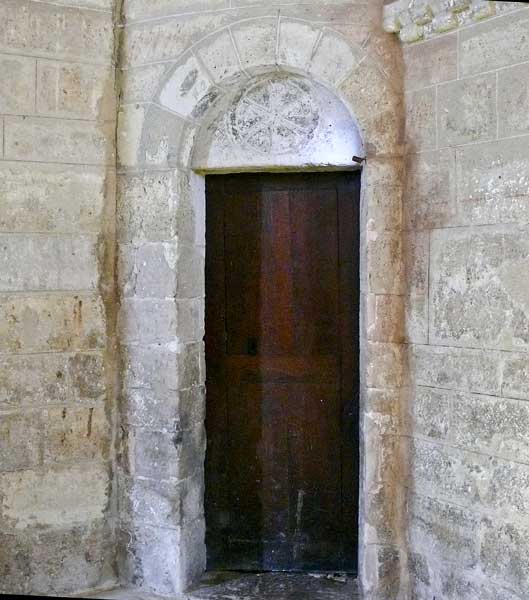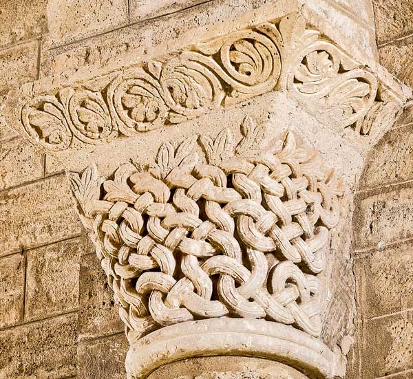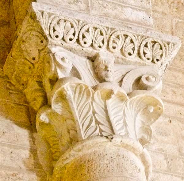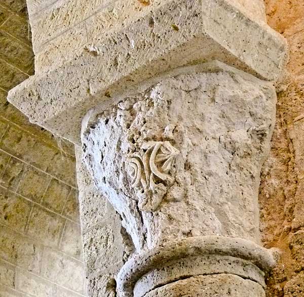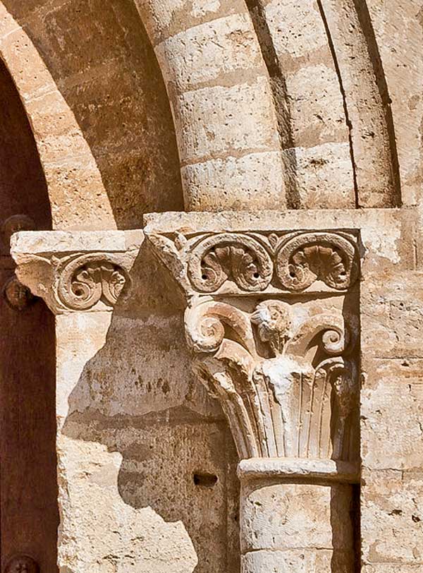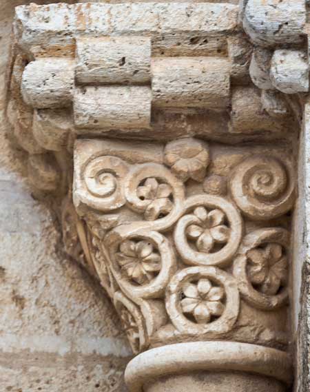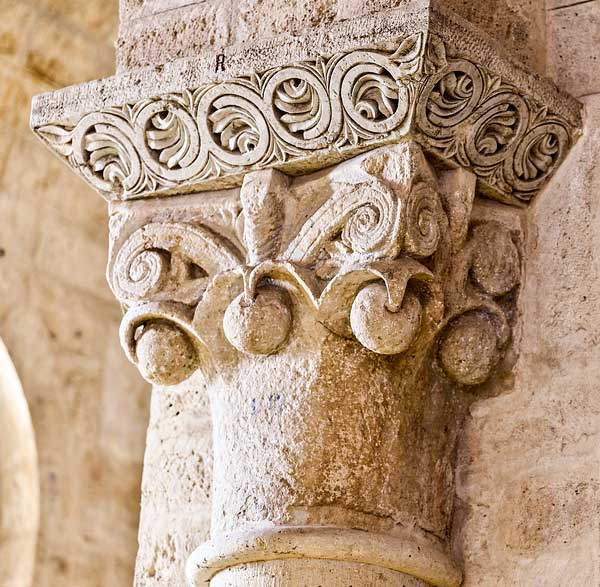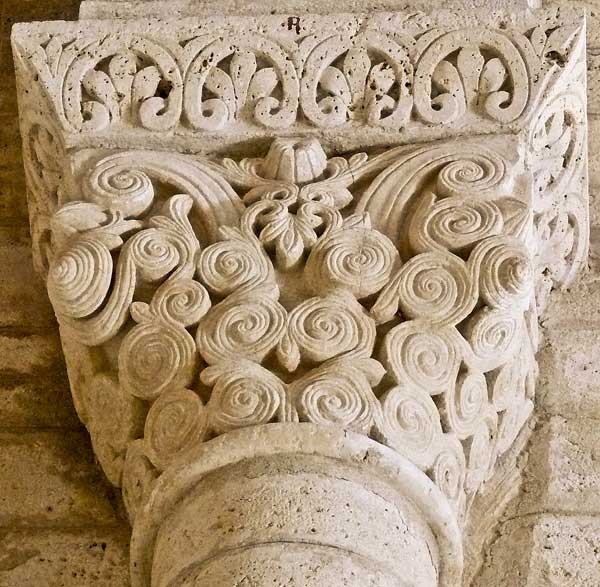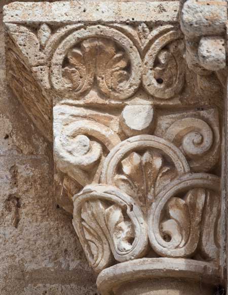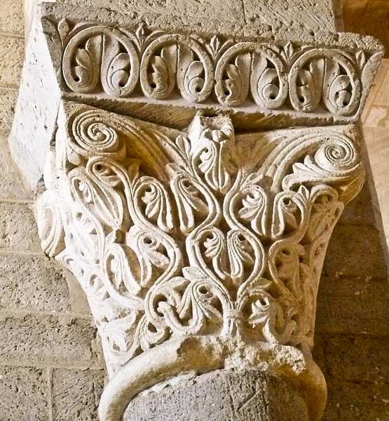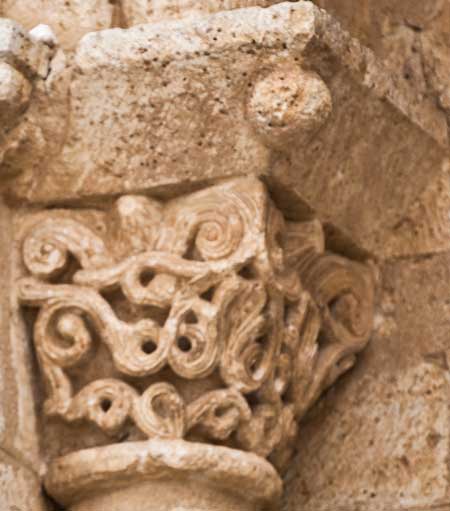 Grandes hojas lisas con un nervio central de cuyo extremo superior pende un fruto esférico. Dos sencillos caulículos completan la cesta. Este capitel, aunque no presenta la R que lo identificaría como repuesto, no sólo ha sido renovado sino que es distinto al que ocupaba su lugar antes de la restauración. Como se observa en la Foto 06 y con más detalle en esta imagen el tambor del capitel primitivo estaba constituido por dos órdenes de volutas vegetales. Ignoro el paradero de aquel capitel y las causas de su sustitución. El cimacio se adorna con veneras y palmetas internas, pudiendo ser el original. |