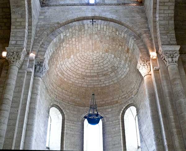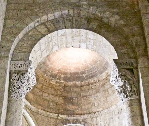 Al tratar de los capiteles: «En general se presentan en buen estado; sólo hemos observado en el capitel del lado del ábside en el arco toral de la derecha de la nave transversal grandes hendiduras o rajas».