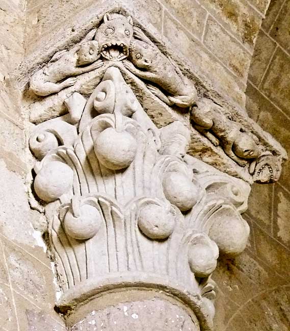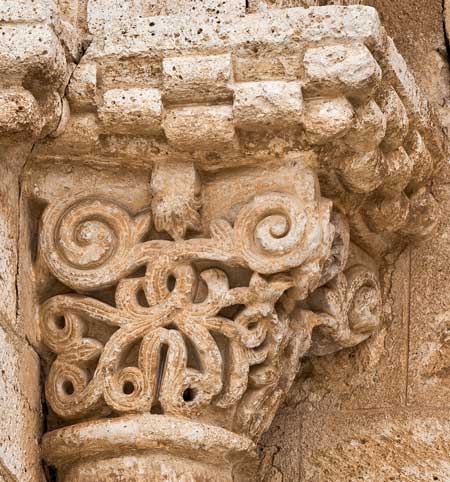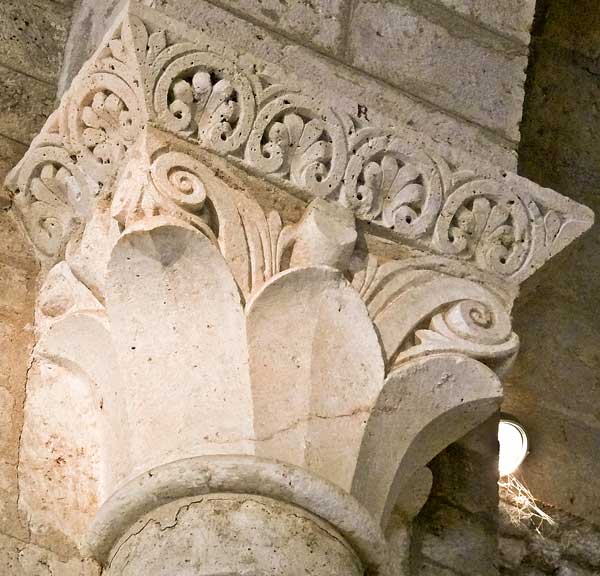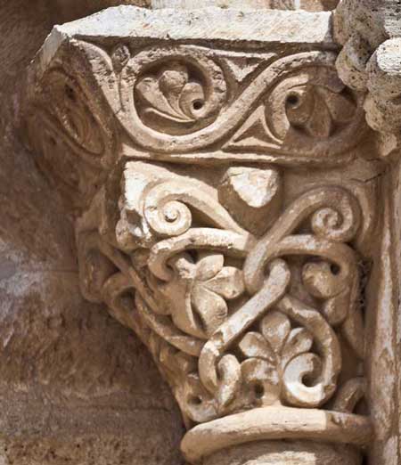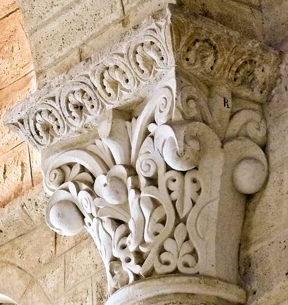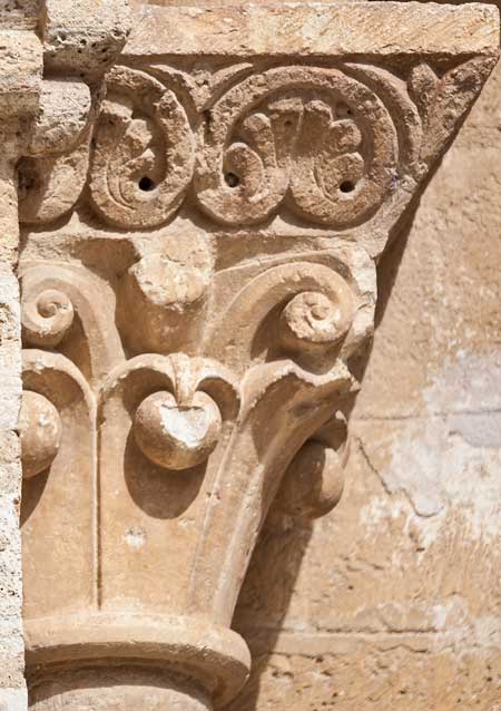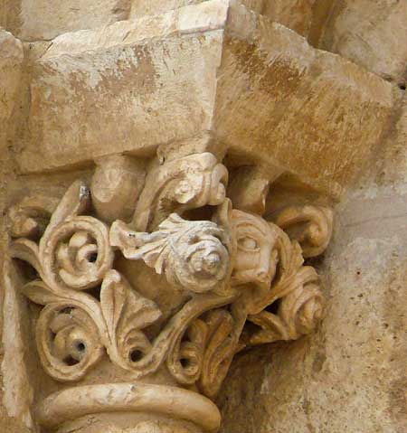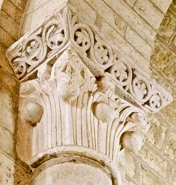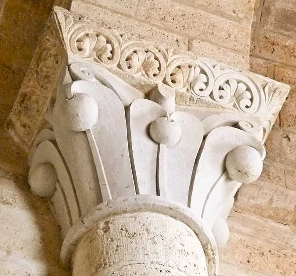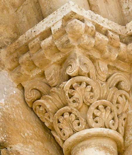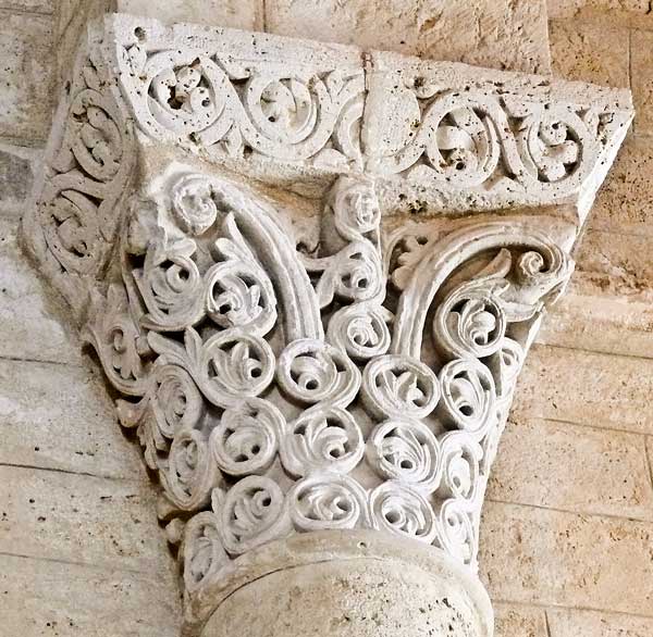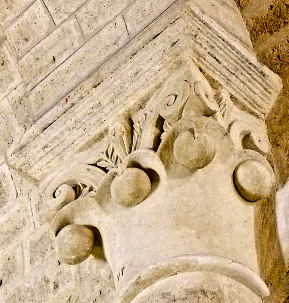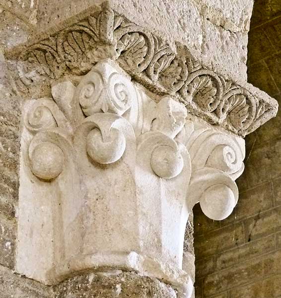 Hojas esquemáticas de cuyos extremos vueltos penden frutos esféricos. Sencillos caulículos asoman por encima. El cimacio se adorna con tacos. Todo el conjunto es un tanto tosco y primitivo. |
