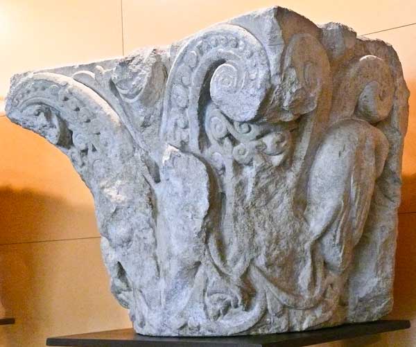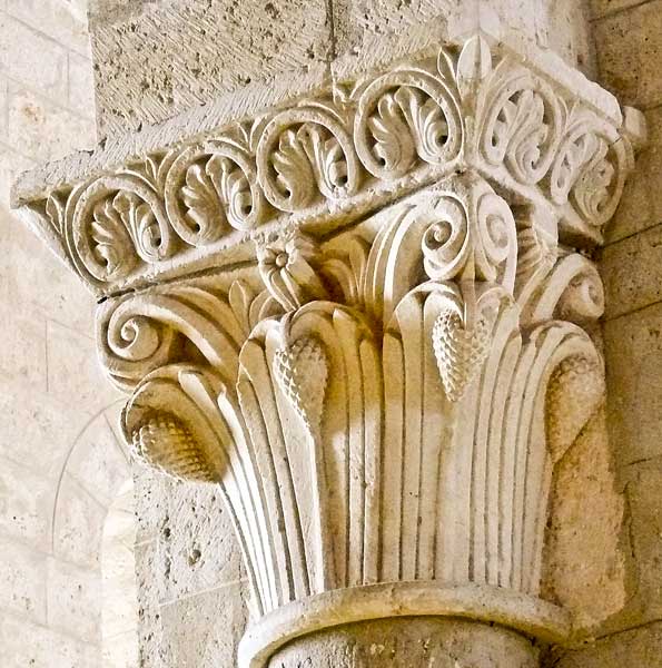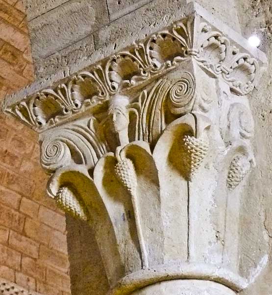 Capitel muy parecido al anterior con la salvedad de que los frutos colgantes son ahora piñas. El cimacio muestra también veneras, palmetas y hojas lanceoladas. |