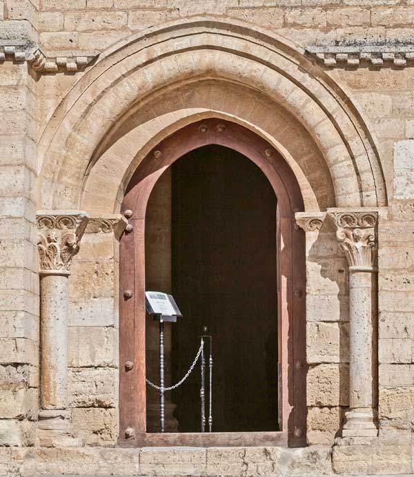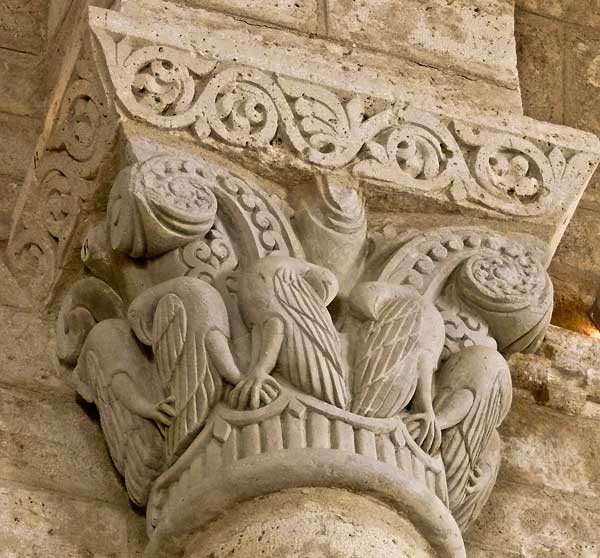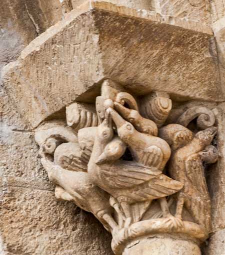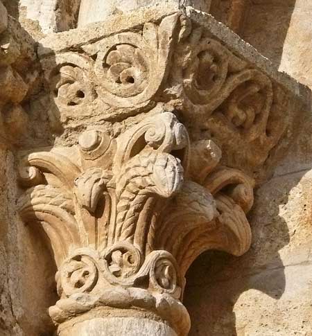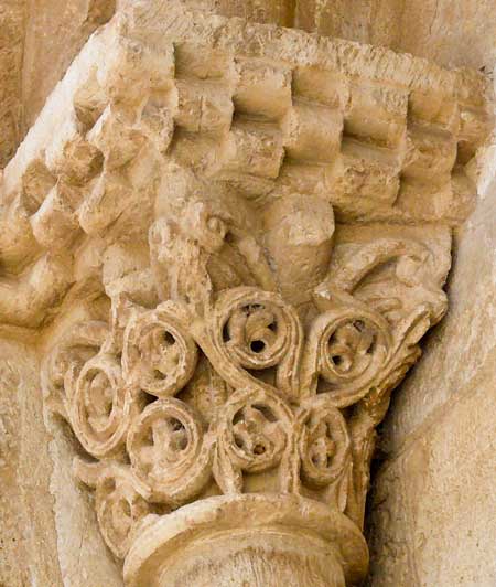 Tanto la cesta del capitel como el cimacio muestran en la cara izquierda la R indicativa de que han sido repuestos. Como se aprecia en la Foto 05 este capitel estaba destrozado y cubierto de yeso apoyando sobre un modillón que había sustituido al fuste de la columna. Lo que queda del primitivo capitel se encuentra en el Museo Arqueológico de Palencia. La composición la forman seis pelícanos, dos por cada cara, que vuelven sus cuellos hacia atrás y que no posan sus patas sobre el astrágalo, como suele ser lo normal, sino sobre un podio de estrías verticales. Se completa la decoración con caulículos lisos en las caras laterales y adornados con botones los de la cara frontal. El cimacio es de roleos con palmetas. |