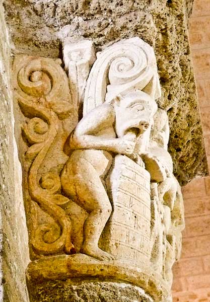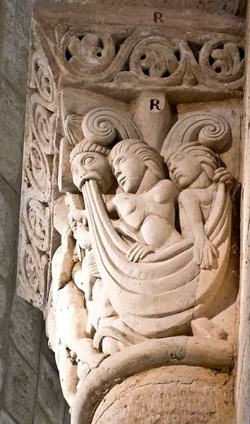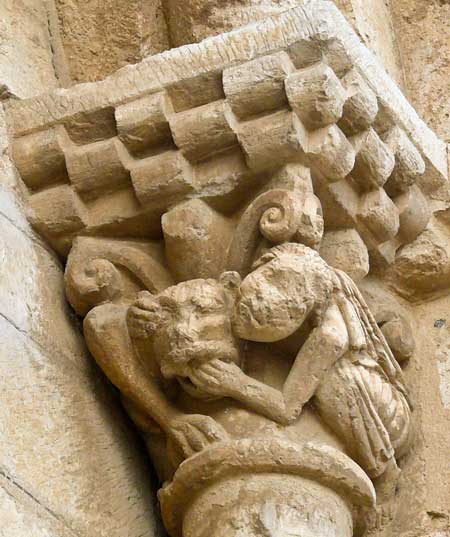 Este capitel, en el que aún se conservan restos de policromía, está en consonancia temática con el izquierdo de la portada norte pues representa dos de los pecados más escenificados en la iconografía románica: la avaricia y la lujuria. En efecto, en la cara frontal se nos muestra al avaro aferrado con las dos manos a la bolsa en la que atesora su peculio. Dos diablos alados, uno a cada lado ocupando las aristas de la cesta, lo atenazan por la cabeza mientras que una feroz máscara situada sobre ella parece que va a devorarlo. En la cara izquierda se simboliza la lujuria en forma de mujer desnuda (a la que le falta la cabeza) que trata de sujetar con la mano izquierda una serpiente que la acecha y levanta la derecha por el lado en que otra serpiente se descuelga del espacio que deja el caulículo. En la cara derecha se repite la escena con la representación más clásica de la mujer desnuda a la que dos serpientes muerden los pechos. Un desciende desde el arbol del que cuelgan las piñas y la otra desde el caulículo; a ambas las sujeta con sus manos. El cimacio se decora con tacos jaqueses. |