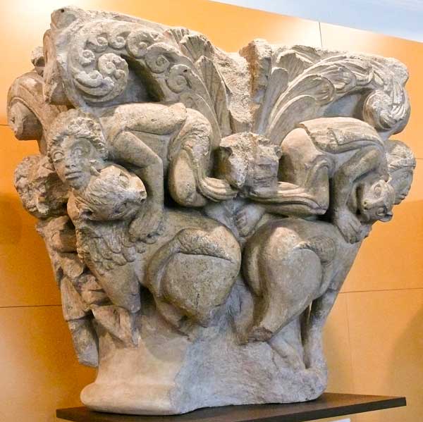 La composición de este capitel se asemeja a la del nº 6. Dos leones que oponen sus cuartos traseros y vuelven sus cabezas hacia atrás son cabalgados por sendos personajes que se aferran a ellos por el cuello. En el centro de la cara frontal se ve una cabeza de animal y por encima de la escena dos caulículos adornados con espirales. En la cara izquierda se contorsiona un individuo desnudo que parece atrapado por un tallo vegetal. En la cara derecha Un personaje vestido que apoya su mano izquierda sobre el pecho del león y una máscara animalesca de la que emergen dos caulículos estriados. El cimacio lleva como ornamento una serie de veneras con palmetas inscritas y hojas lanceoladas. |