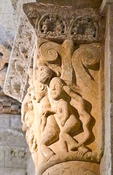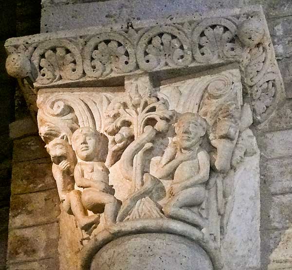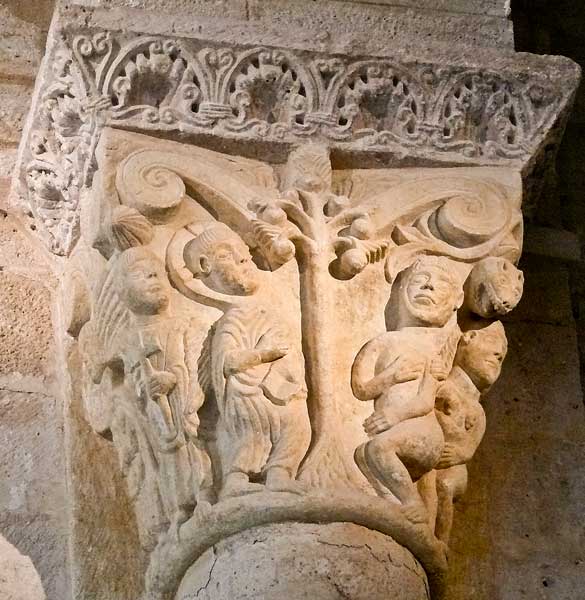 Se escenifica en este capitel el pasaje bíblico referente a Adán y Eva en el paraíso. Eva recibe el fruto prohibido que le ofrece la serpiente enroscada al tronco del árbol del bien y del mal; Adán se lleva una mano a la garganta consciente de su acción mientras con la otra se tapa púdicamente, lo mismo que hace Eva. En la cara izquierda una figura humana con cabeza de animal, el demonio, acerca su mano a la boca susurrando algo a Eva. Tras él, un personaje de pie con báculo. En la cara derecha otro personaje con similar indumentaria y pose, y una cabeza de animal en el ángulo que está devorando a un ser humano. Como siempre varios caulículos llenan el resto de la cesta. El cimacio presenta veneras con palmetas inscritas. |