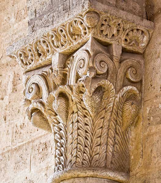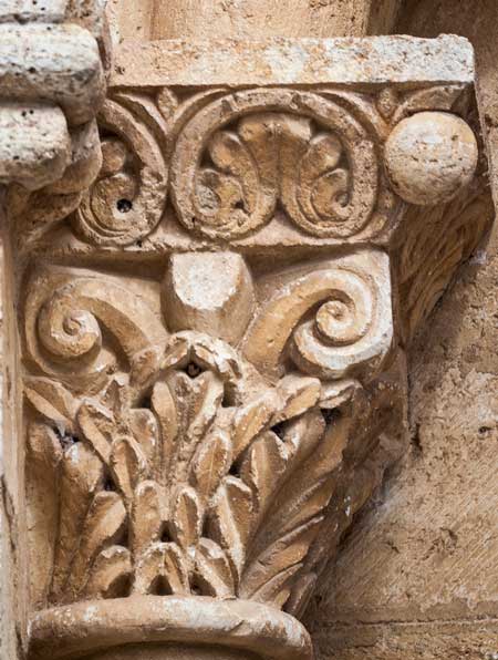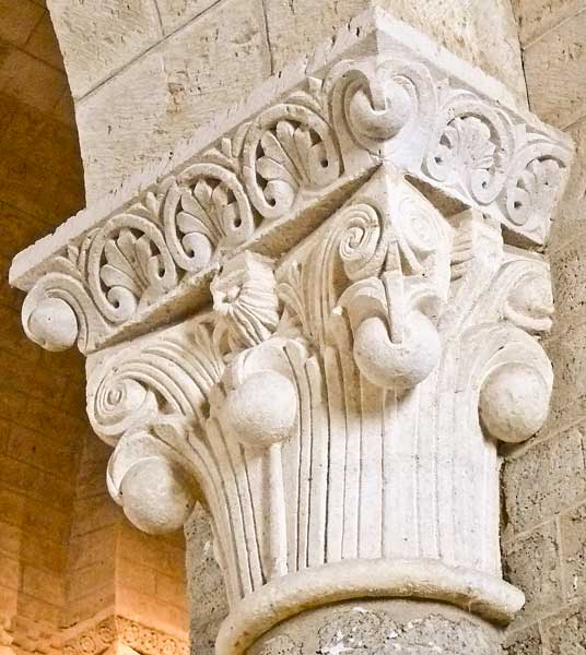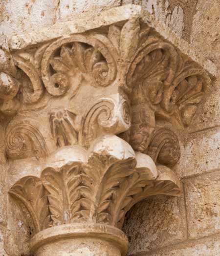 Una repetición más de la ornamentación a base de hojas de palma lisas con arista central de cuyos extremos cuelgan frutos esféricos. Como siempre los caulículos asoman por encima de ellas. En el cimacio se han tallado veneras con palmetas inscritas y hojas lanceoladas. |