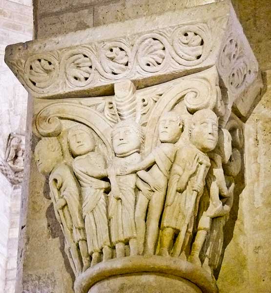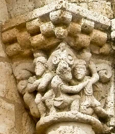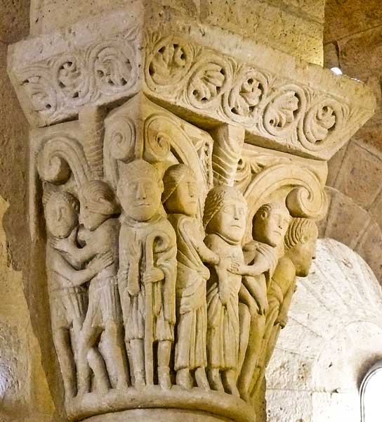 Sobre la iconografía de este capitel se han hecho interpretaciones tan dispares como querer ver en él el pasaje evangélico del prendimiento de Jesús o el conflicto de los burgueses tratado en el Concilio de Burgos de 1117. Lo que se ve en la cara frontal es un personaje central que asoma su brazo derecho bajo la túnica para sumarse al encuentro de las manos de los dos personajes que lo flanquean que las unen sobre su pecho. El situado a su izquierda aparece desnudo y tapándose los órganos genitales con la mano mientras el personaje central pone la suya sobre su ingle. En las aristas se colocan dos clérigos -obispos o abades- con báculo y en actitud de bendecir. En la cara izquierda se aprecia una pareja en actitud de lucha, con las piernas cruzadas, uno asiendo por el cuello al contrario mientras este sujeta a su oponente por el pecho y la cabeza. En la cara derecha, por el contrario, los dos personajes presentes en ella se disponen a abrazarse afectuosamente |