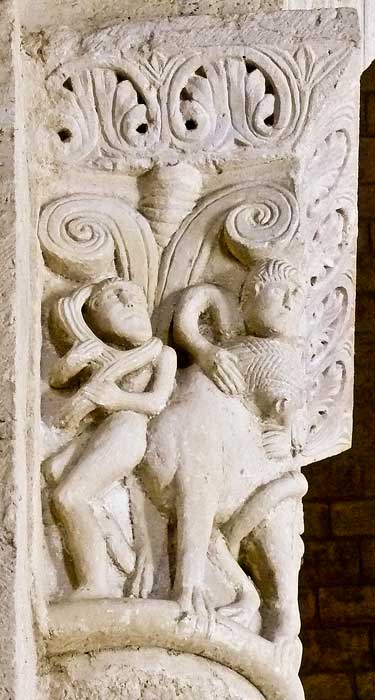 Como se ve en la Foto 06 este capitel se encontraba antes de la restauración cubierto de una capa de yeso sobre la que se habían realizado algunas pinturas modernas, si bien el capitel no había sufrido daño alguno. Fue desmontado para la reposición del fuste de la columna que faltaba y se almacenó en la propia obra a la espera de ser montado de nuevo. Entre tanto, algún bárbaro moralista escandalizado por la desnudez de las figuras centrales lo destrozó a martillazos. El capitel original así desfigurado y maltrecho se encuentra en el Museo Arqueológico de Palencia. Su indudable corte clásico queda explicado si se admite que el artista que lo talló conoció el sarcófago romano del siglo II d. de C. que se encontraba en la colegiata de la vecina localidad de Husillos hasta que en 1870 fue trasladado al Museo Arqueológico Nacional. En dicho sarcófago se representan escenas de la Orestiada, razón por la que a este capitel se le suele denominar como «el de la Orestiada». En las dos figuras desnudas -femenina la una y masculina la otra- de la cara frontal hay quien ve a Adán y Eva sin faltar quien afirma que debería tratarse de Caín y Abel, si bien en la restauración se le habría dotado erróneamente a Abel de un órgano genital femenino. Tanto en la cara izquierda como en la cara derecha una serie de Furias con serpientes recuerdan la leyenda de Orestes. El cimacio se adorna con roleos y palmetas. |