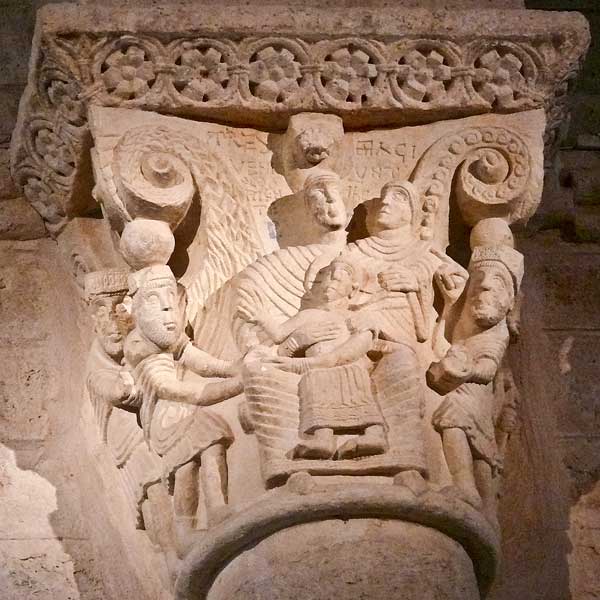 En este capitel se representa el pasaje evangélico de la adoración de los Reyes Magos. María mantiene en su regazo a Jesús dotado de nimbo crucífero; junto a ellos otra figura femenina sin identificar. En la parte alta, entre los dos grandes caulículos de dispar ornamentación, una inscripción pregona que: «TRES MAGI VENERUNT AB ORIENTE JHE[ROSOLIMAM]». En la cara izquierda aparecen dos de los tres Reyes Magos oferentes coronados con casquetes poligonales y en la cara derecha se ve el tercero de los Magos en similar actitud y atuendo y, por otra parte, un personaje con una mano alzada en señal de bendición y la otra sobre un cayado que representa a san José a tenor de lo que expresa la inscripción que se muestra sobre él: «IOSEP». El cimacio se adorna con círculos enlazados en cuyo interior se inscriben rosetas hexapétalas. |