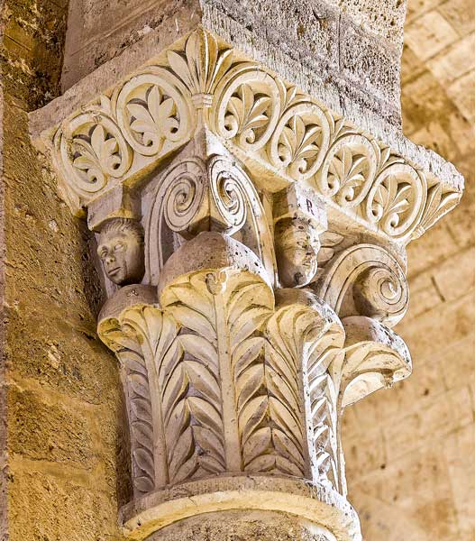 Grandes hojas de palma por detrás de las cuales se elevan los habituales caulículos. En el espacio superior central de cada cara se ha tallado una cabeza humana o de simio. El cimacio muestra veneras con palmetas interiores y un haz de hojas lanceoladas en cada arista. Tanto la cesta del capitel como el cimacio lucen la R indicativa de que se trata de piezas repuestas. |