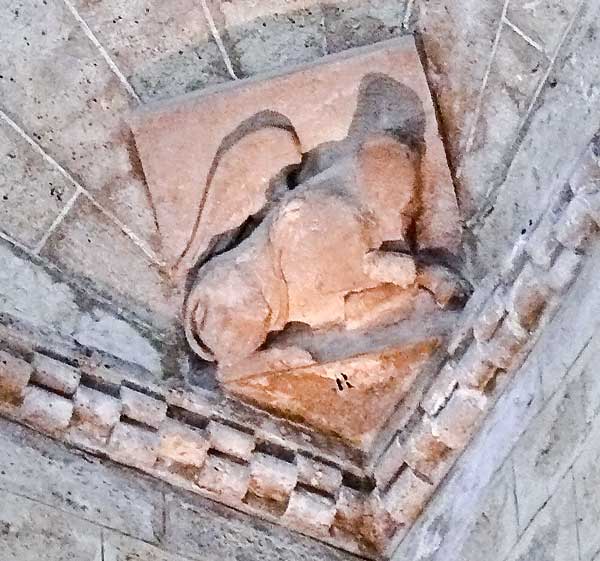 Este capitel, totalmente renovado como da a entender la R sobre el cimacio y la cesta, corresponde a la columna del arco toral de la derecha que fue sin duda una de las que más acusó las insoportables sobrecargas trasmitidas por el recrecido del cimborrio que como ya se ha comentado antes y puede apreciarse en la Foto 06 causaron la rotura de la cesta y la fragmentación del cimacio en varios trozos. El capitel original se encuentra en el Museo Arqueológico de Palencia en el estado en que puede verse en esta imagen, es decir, completamente mutilado, faltándole las patas de los leones y otros elemento que se conservaban intactos antes de ser desmontado tal como se aprecia en este detalle de la citada Foto 06. Desconozco en qué momento y circunstancias se produjo el destrozo que no puede achacarse a razones seudomoralistas como en el caso del capitel nº 5.