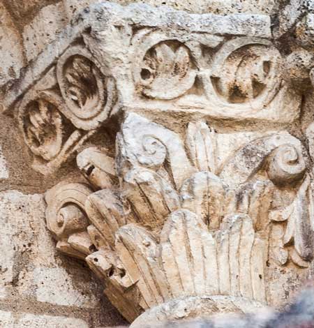 La cesta renovada de este capitel presenta ornamentación vegetal a base de tallos terminados en volutas, hojas con bolas en su extremo y caulículos. El cimacio, que sí es original, se adorna con veneras y palmetas |