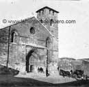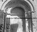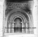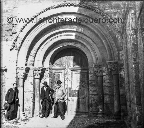 La fotografía de M. Aníbal Álvarez sólo abarca escasamente la portada sin mostrarnos el valioso friso superior. El cotejo de esta imagen con una reciente evidencia que toda la decoración escultórica de la arquivolta, chambrana, capiteles, fustes e impostas se conserva en similar estado al que tenía algo más de un siglo atrás. A la restauración llevada a cabo en torno a 1990 se debe la renovación de la sillería de la parte baja del muro y de las jambas, así como el remate del pie de los fustes y sus basas.