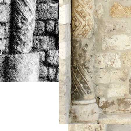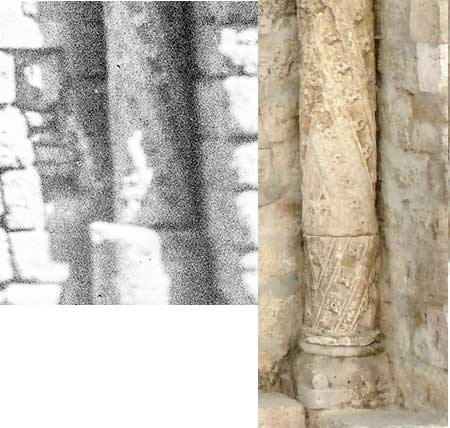 Aquí puede verse un detalle de la columna izquierda antes y después de la restauración. Ambas imágenes están yuxtapuestas y niveladas de forma que haya correspondencia en vertical. Puede observarse que el fuste antiguo descansaba sobre un rústico basamento y que se encontraba muy deteriorado en su parte baja habiendo disminuido su sección. En la restauración se rebanó una porción de su extremo inferior y se suplementó con un alto tambor que sigue las pautas decorativas del resto del fuste pero que no concuerda exactamente. También se le dotó de una basa.
