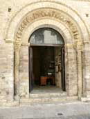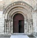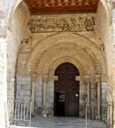 En la fotografía de principios del pasado siglo puede apreciarse, además del típico carruaje de la época, varias personas sentadas en el basamento de las columnas de la jamba derecha de la portada, lo que da idea de la altura de dicho podio. Hoy, como lo expresan en la Enciclopedia del Románico, «El zócalo, ya perdido por el paso de los siglos y la fuerte erosión, se ha convertido en alto banco de hormigón moderno», que es lo que se ve en la fotografía reciente. Por lo demás, las innovaciones se refieren a la cubierta del tejaroz y, sobre todo, a aspectos urbanísticos del entorno que ha cambiado ostensiblemente. |