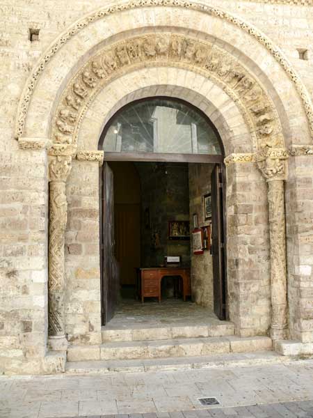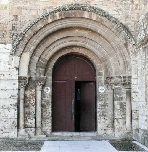 Templo que en origen debió poseer tres naves con sus correspondientes ábsides en hemiciclo ha pasado a ser hoy un espacio museístico de nave única. Hundidas las bóvedas en el siglo XV se rehizo en el siglo siguiente reuniendo los espacios en una sola nave y conservando los ábsides. En 1811 fue incendiado como acto de estrategia militar frente a las tropas napoleónicas y se volvió a reconstruir en 1849. De todos esos avatares se ha salvado la fachada que luce sobre la portada un soberbio friso de la mejor talla románica.