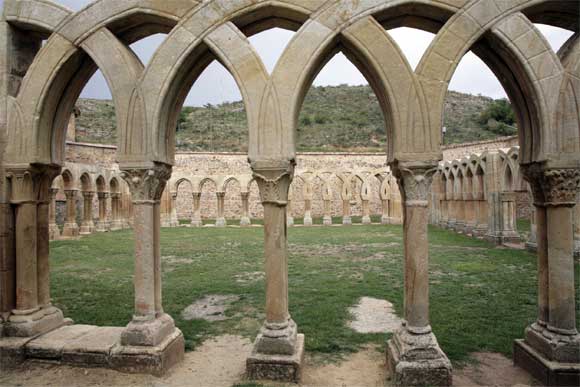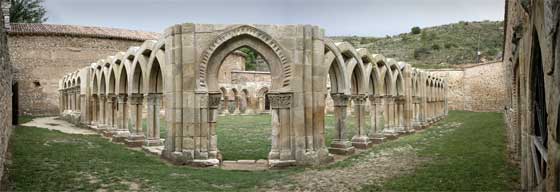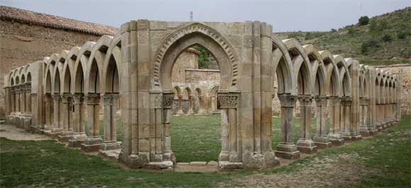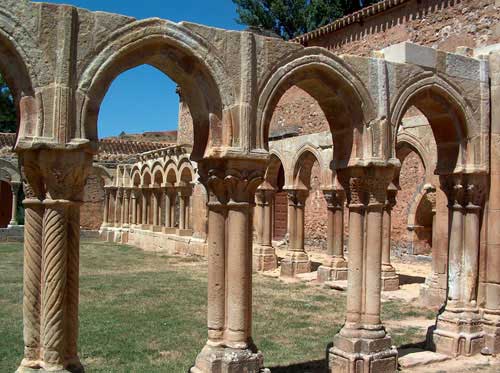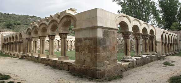 Se trata de arcos plenamente románicos, de medio punto, lisos en su dovelaje y en su chambrana. Montan sobre banco corrido de escasa altura. Se remata la arquería mediante cornisa de poco vuelo soportada por canecillos esculpidos. Todo hace indicar que al menos por el lado N sí estuvo cubierto el claustro. Las columnas poseen doble fuste y capiteles tallados que alternan las representaciones de temas vegetales con otros historiados o de figuras animalescas más o menos quiméricas. |