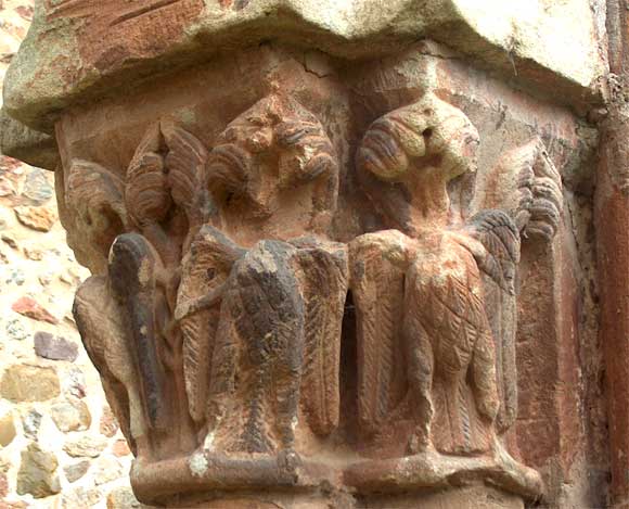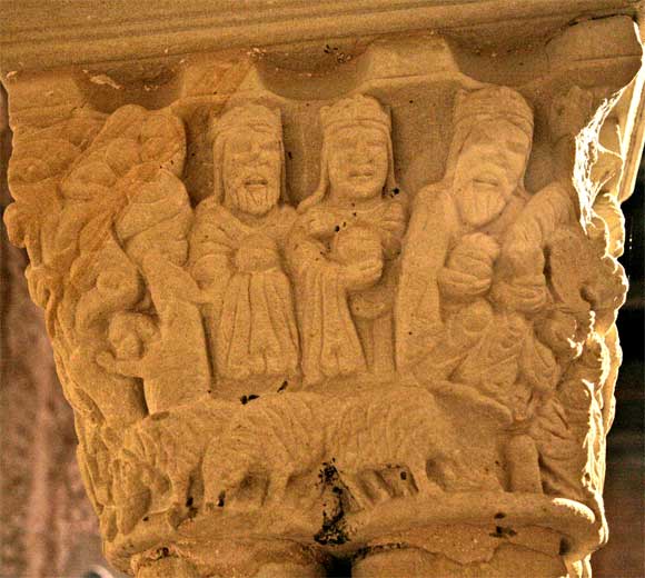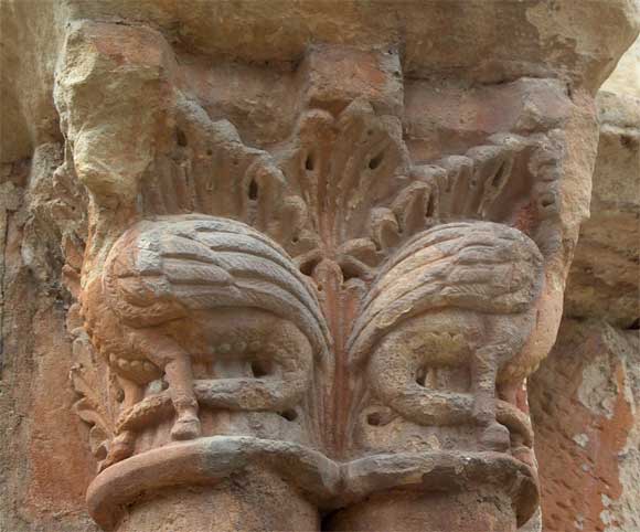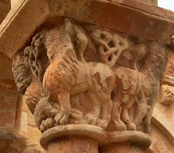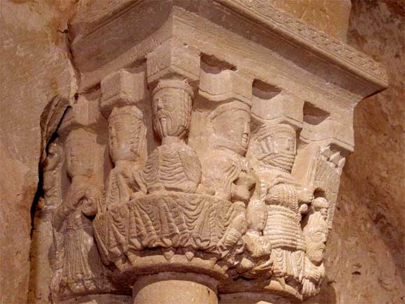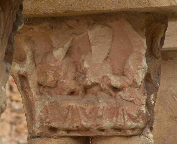 En la concavidad de este ángulo se disponen tres columnas acodilladas de las que, una ha desaparecido por completo, capitel incluido, y otra a perdido el fuste. Los capiteles que perduran, muy estropeados, parecen representar escenas pastoriles con rebaños de ovejas. |