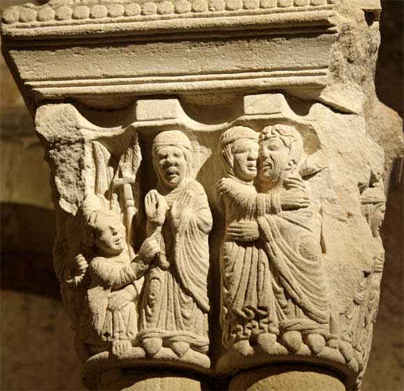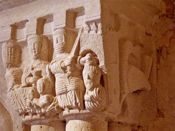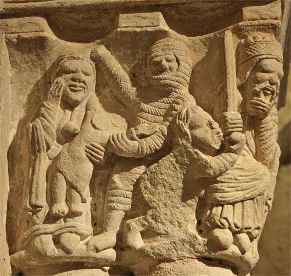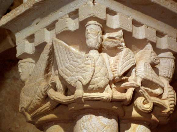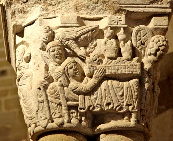 Templete izquierdo. Capitel delantero izquierdo La decapitación de San Juan Bautista: se celebra un banquete simbolizado por la mesa bien servida a la que se sienta en el centro Herodes, barbudo y coronado, y a su lado Herodías; asisten otros dos personajes. Salomé se encuentra arrodillada a los pies de su madre. El verdugo, enfundado en una cota de malla, sostiene alzada la espada con la que se dispone a cortar la cabeza del Bautista que permanece en el interior de una fortaleza en muestra de cautiverio. Ocupa la cara interna del capitel un ave en cuyo pico parece llevar una mano. |