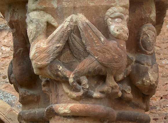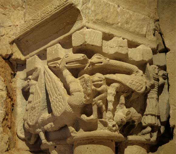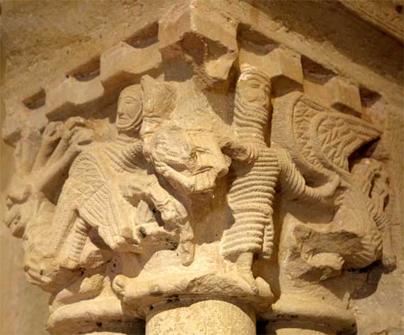 Templete izquierdo. Capitel de rincón Muestra una escena ya vista en el claustro del monasterio benedictino de San Pedro el Viejo, en Huesca: varios monstruos en forma de reptiles alados y un soldado que, protegido con una cota de malla y blandiendo una espada, se enfrenta a ellos. |