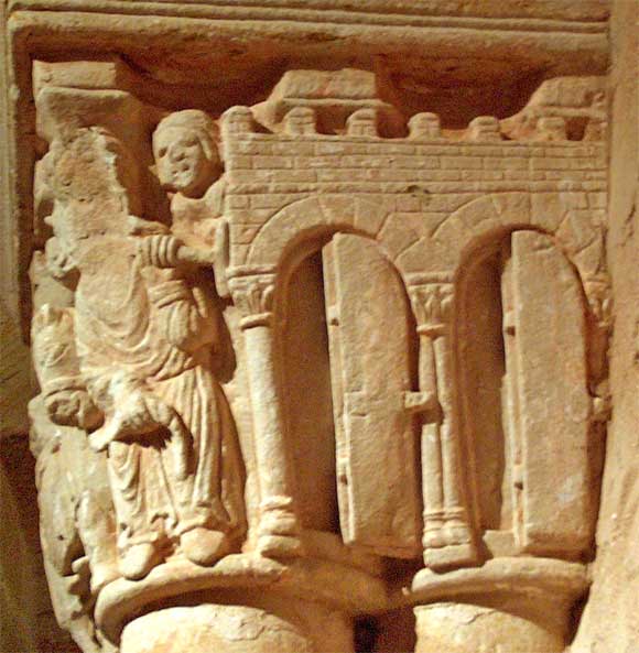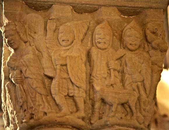 Templete derecho. Capitel delantero derecho En él se escenifica la huída a Egipto. La figura de San José, que conduce al pollino y carga con un hatillo al hombro, está muy deteriorada. Un ángel escolta a la breve comitiva. Completa el conjunto una fortaleza almenada con dos puertas entreabiertas formadas por arcos de medio punto de factura románica. |