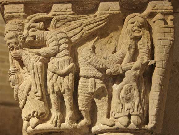 Templete derecho. Capitel posterior izquierdo La degollación de los Santos Inocentes. Herodes ocupa una de las aristas del capitel, mostrándose con corona y con una espada en la mano mientras con la otra se mesa la barba. En una de las caras, una madre le suplica arrodillada a su costado derecho a la vez que, en la otra cara, el diablo le susurra malos consejos al oído izquierdo. Dos soldados arrancan de los brazos de sus madres a dos niños para pasarlos por la espada. |