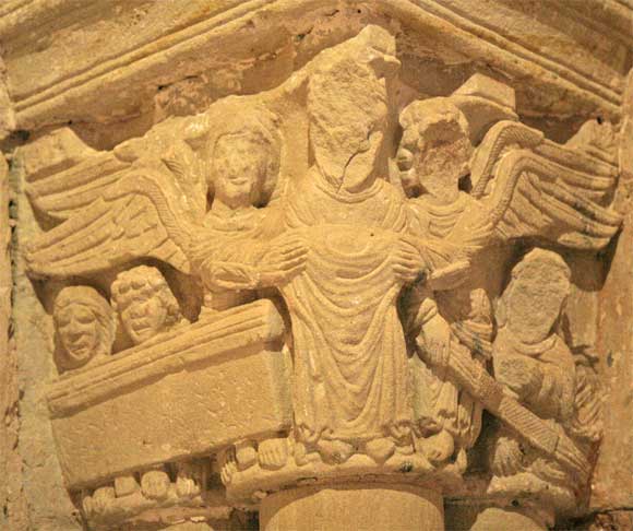 Templete derecho. Capitel de rincón La resurrección de Jesús que es llevado por dos ángeles. Otros dos ángeles dejan ver sus cabezas por encima del sepulcro. |