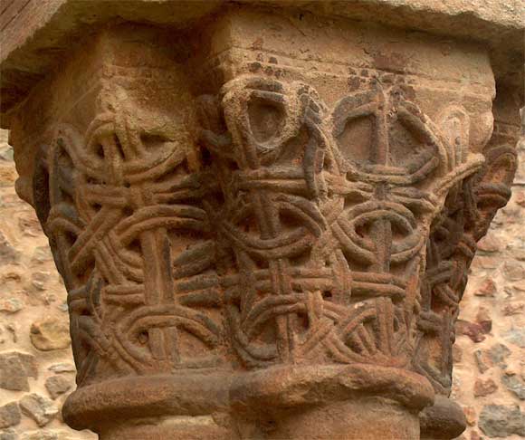 Este ángulo también cuenta con chaflán, y en él un arco túmido doblado como los de las esquinas NE y SE con la salvedad de que este caso el arco interior monta sobre columnas adosadas a las jambas, y el exterior sobre columnas acodilladas de fuste de menor sección. En todo caso los capiteles se decoran con cordones finamente entrelazados. |