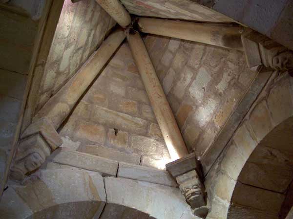 Cuatro nervios cilíndricos, a modo de fustes de esbeltas columnas, en posición angular apoyan sobre sendas ménsulas, dos de las cuales representan cabezas humanas, otra de dragón y la última un motivo vegetal. Entre los nervios, cuatro paños triangulares formando la pirámide interior. |