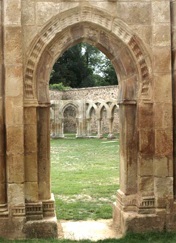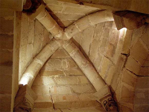 Las arquerías que concurren en este ángulo están constituidas por arcos apuntados cruzados que cargan sobre columnas de doble fuste. Los capiteles son de formas vegetales con variedad de hojas, palmetas y frutos. |