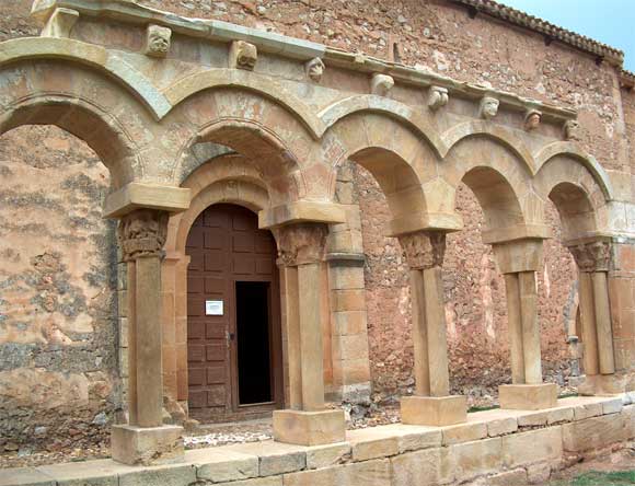 En el medio del lado S no existe, como en los otros tres lados, una pilastra de conexión entre las diferentes arcadas de ambos extremos, sino que se abre un hueco formado por un arco apuntado algo túmido y dos semiarcos; falta el soporte central, alarde arquitectónico ya visto en otros lugares como en el tímpano de San Miguel de Caltojar o en el de Santiago del Burgo (Zamora). El arco completo apoya en columnas de doble fuste adosadas a las jambas, con capiteles de ornamentación vegetal. |